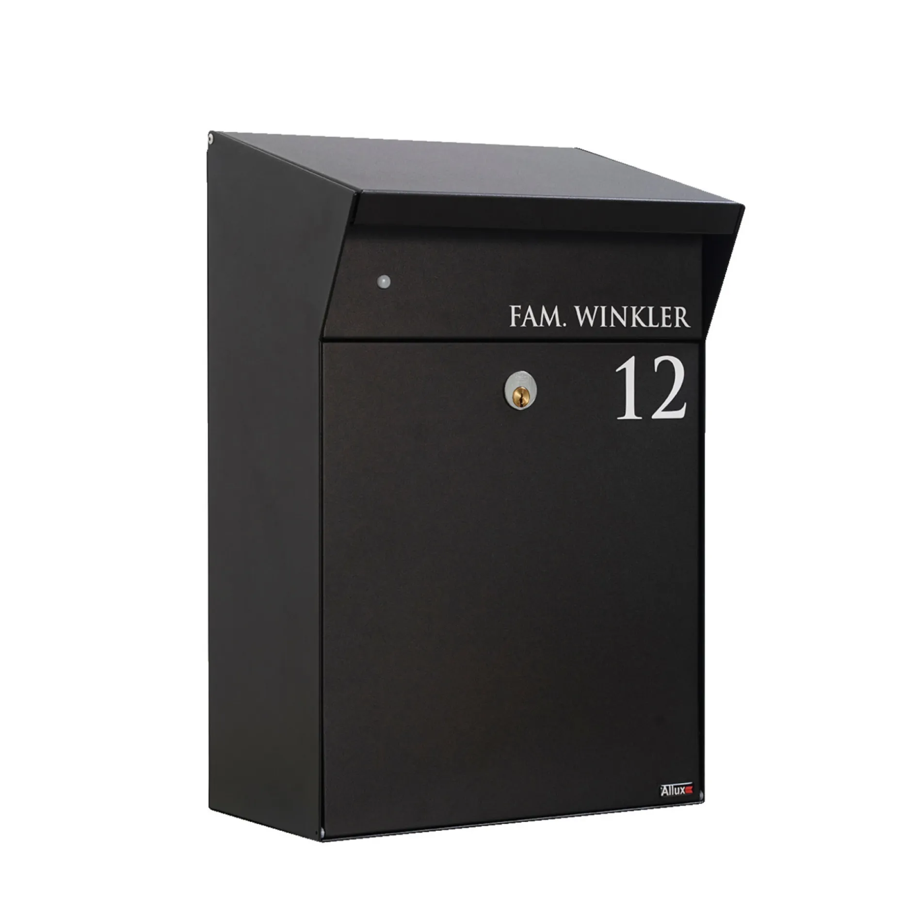 Postkasse med LED belysning, designet af Christian Bjørn. Fremstillet i kraftig pulverlakeret galvaniseret stål med Ruko lås. LED lysindstilling af tid og skumring.