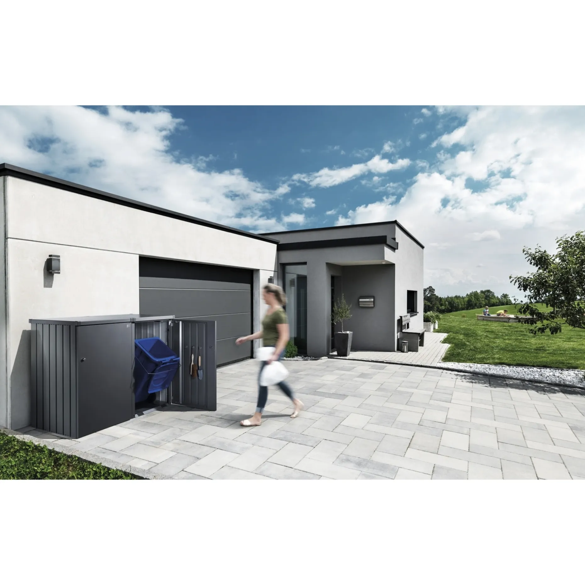 Det moderne design og smarte detaljer giver et stilrent udseende, så affaldsspandene fremstår pænt indrammet ved huset eller i haven. Den mørkegrå metallic overflade fremhæver det moderne udtryk og passer godt til facader og flisearealer.
