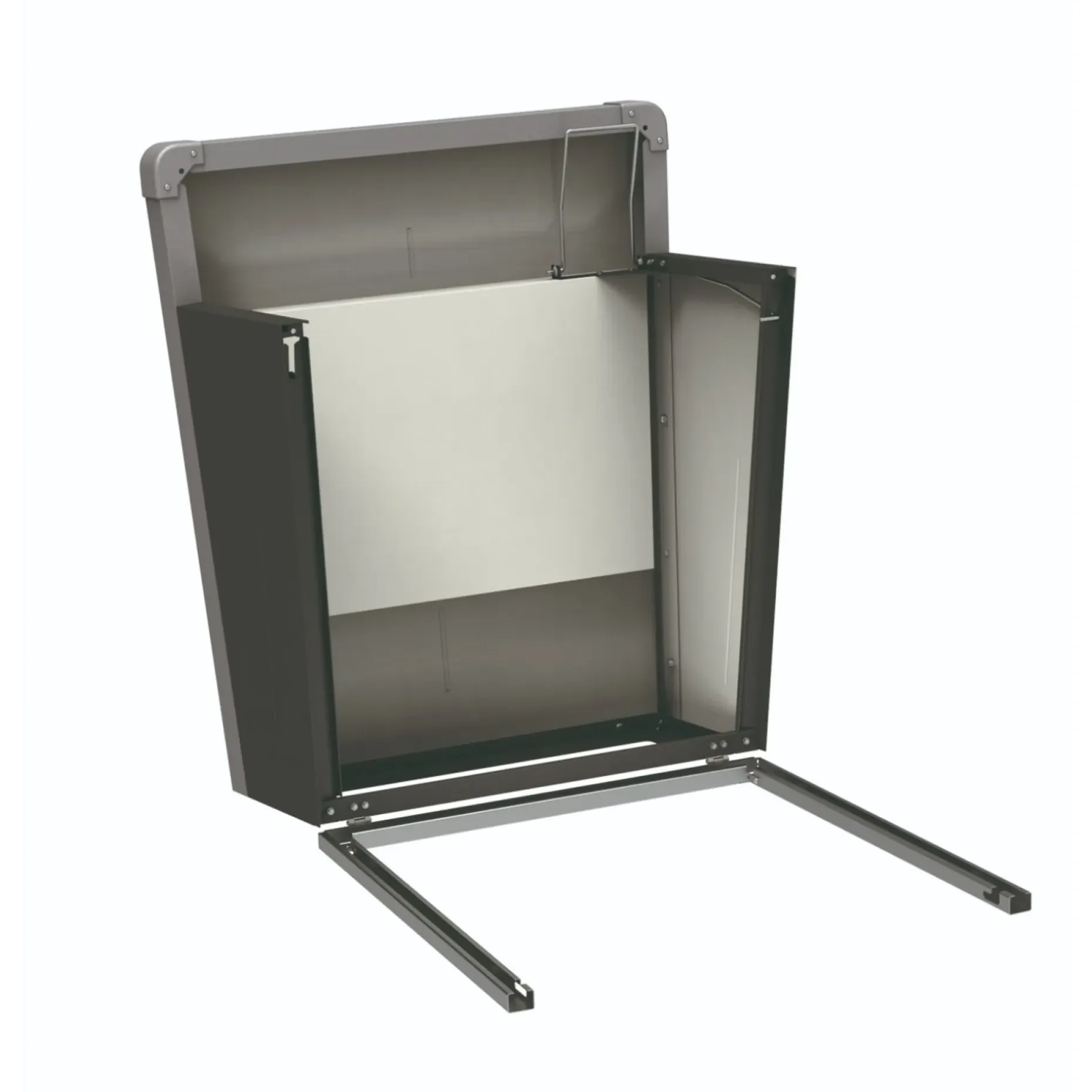Med to størrelser kan du vælge en garage, der matcher robottens mål og havens rumlige forhold. Det opklappelige låg sikrer, at betjeningspanelet er tilgængeligt uden at robotten skal flyttes, og sikringslåsen beskytter mod utilsigtet åbning.
