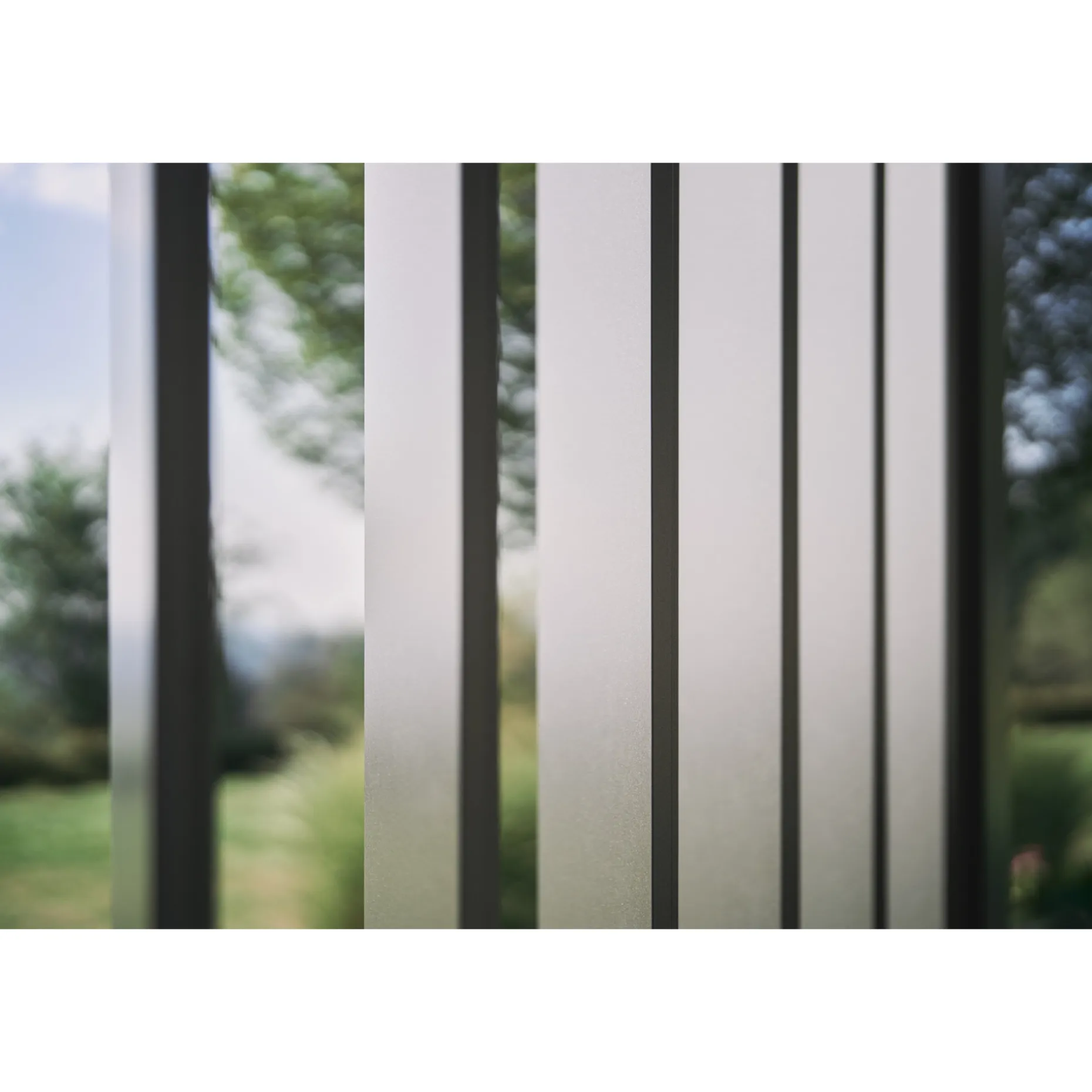Den louverede sidevæg er udviklet som en funktionel afgrænsning til pergolaer. Den skaber privathed og visuel ro samtidig med, at louverne tillader lys- og luftgennemstrømning.