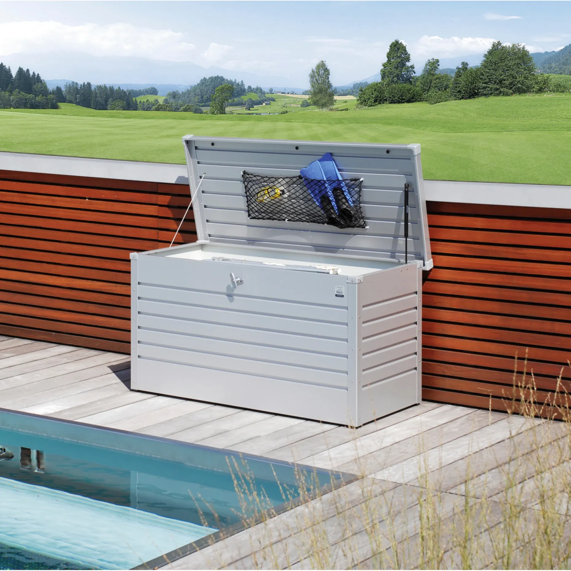 Biohort fremstiller dobbeltlags stålplader, varmgalvaniserede og polyamidbelagte, hvilket giver høj holdbarhed og begrænset vedligeholdelse sammenlignet med træ. Boksen fås i flere størrelser og farver, så du kan vælge model ud fra plads og stil.