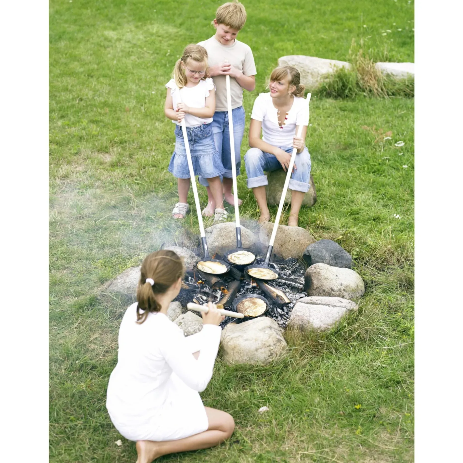 Det er både hyggeligt og hurtigt at bage pandekager med denne pande. Skaftet giver god afstand til ilden, så tilberedningen opleves som sikker, og både voksne og børn kan deltage ved bålet.