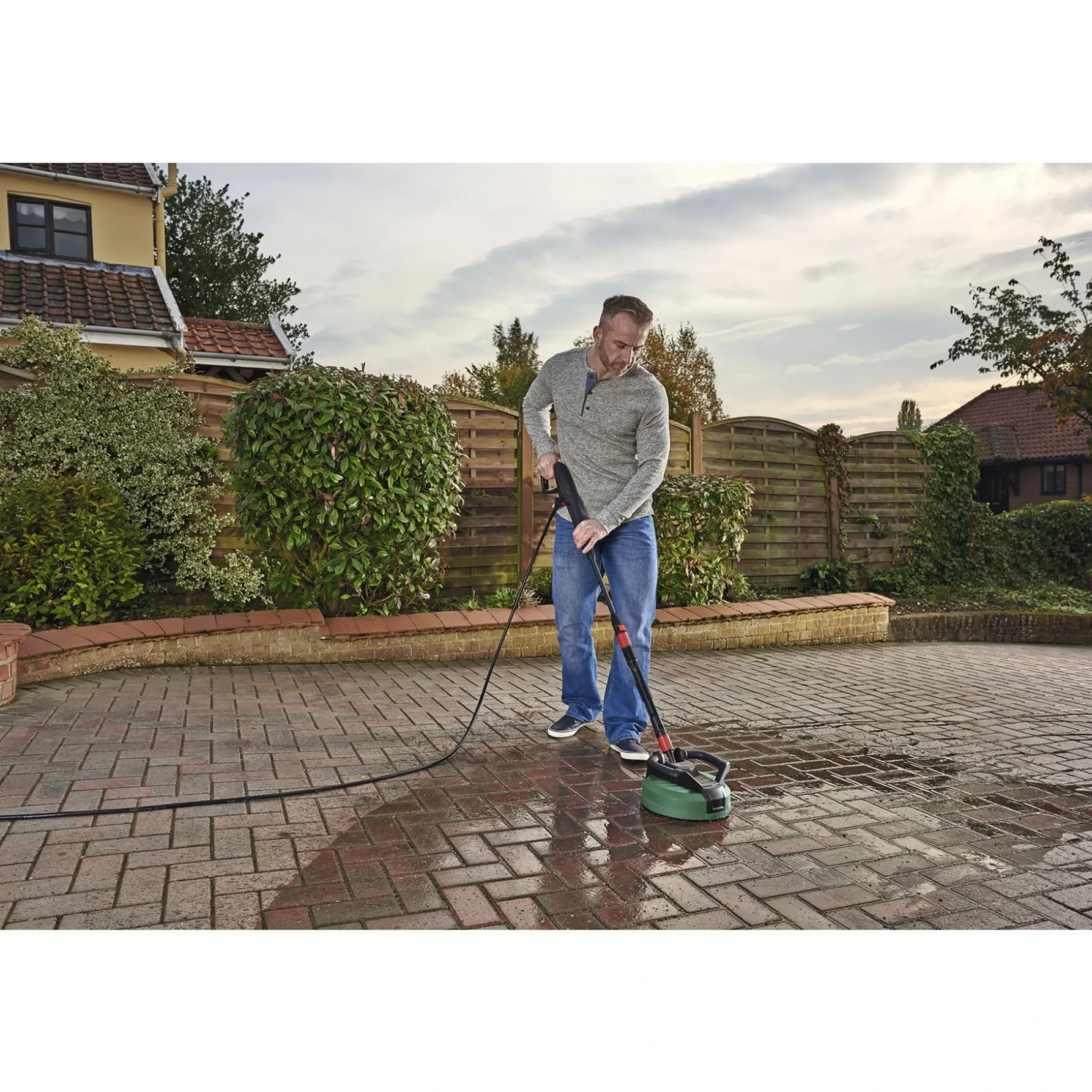 Det drejeled og den ekstra lanse gør det let at nå hjørner og uregelmæssige overflader. De integrerede håndtag gør det muligt at rengøre vægge og garager sikkert og ergonomisk. Den kører nemt over sten, mursten og beklædning, hvilket giver ensartet resultat på forskellige underlag.