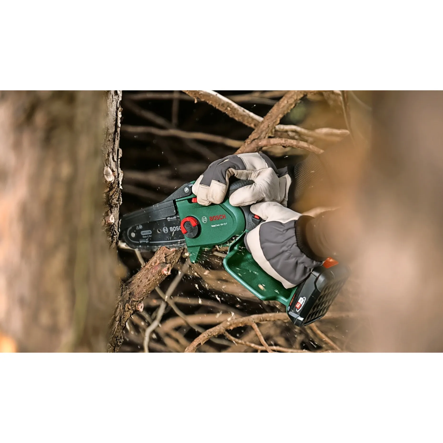 EasyChain 18V-15-7 er en batteridrevet grensav, designet til skæring og styning af træer samt andre gør-det-selv-opgaver i haven. Den kompakte størrelse og det afbalancerede design gør saven let at betjene og giver adgang til grene, der ellers er svære at nå. SDS-systemet gør den hurtig at klargøre uden brug af værktøj. Kvalitetskæden fra Oregon sikrer rene snit i træ med en diameter op til 13 cm, og kædehastigheden på 6,95 m/s er ideel til beskæring. Softgrip-håndtagene øger komforten ved længere brug, og den lette konstruktion gør den velegnet til hobbybrugere og husejere. Med Bosch Syneon Technology optimeres kraft og driftstid, og som en 18V SOLO-enhed leveres saven uden batteri og lader. Den er en del af 18V POWER FOR ALL ALLIANCE, så samme batteri kan bruges til andre 18V POWER FOR ALL-værktøjer.