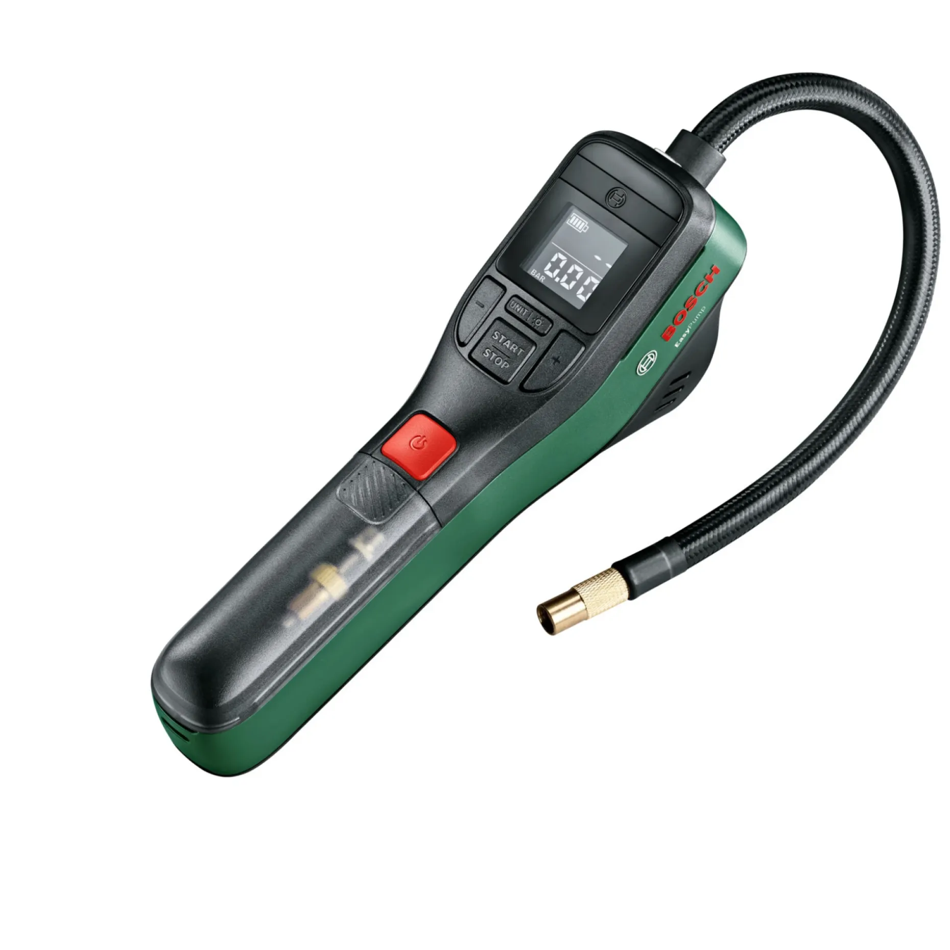 Bosch EasyPump er en kompakt og brugervenlig luftpumpe til oppustning af dæk, bolde og mindre vandsportsudstyr. Med maksimal trykkapacitet op til 10,3 bar (150 psi) og realtidsmåling giver den præcis oppumpning uden overoppustning takket være autostop-funktionen.