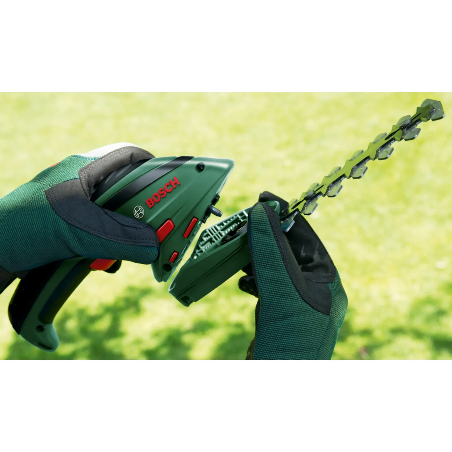 Den leveres med batteri og lader og bruger 3,6V. Batteriet lades fuldt på cirka 3,5 timer og giver op til 50 minutters driftstid, nok til de fleste mindre og mellemstore klippeopgaver i haven.