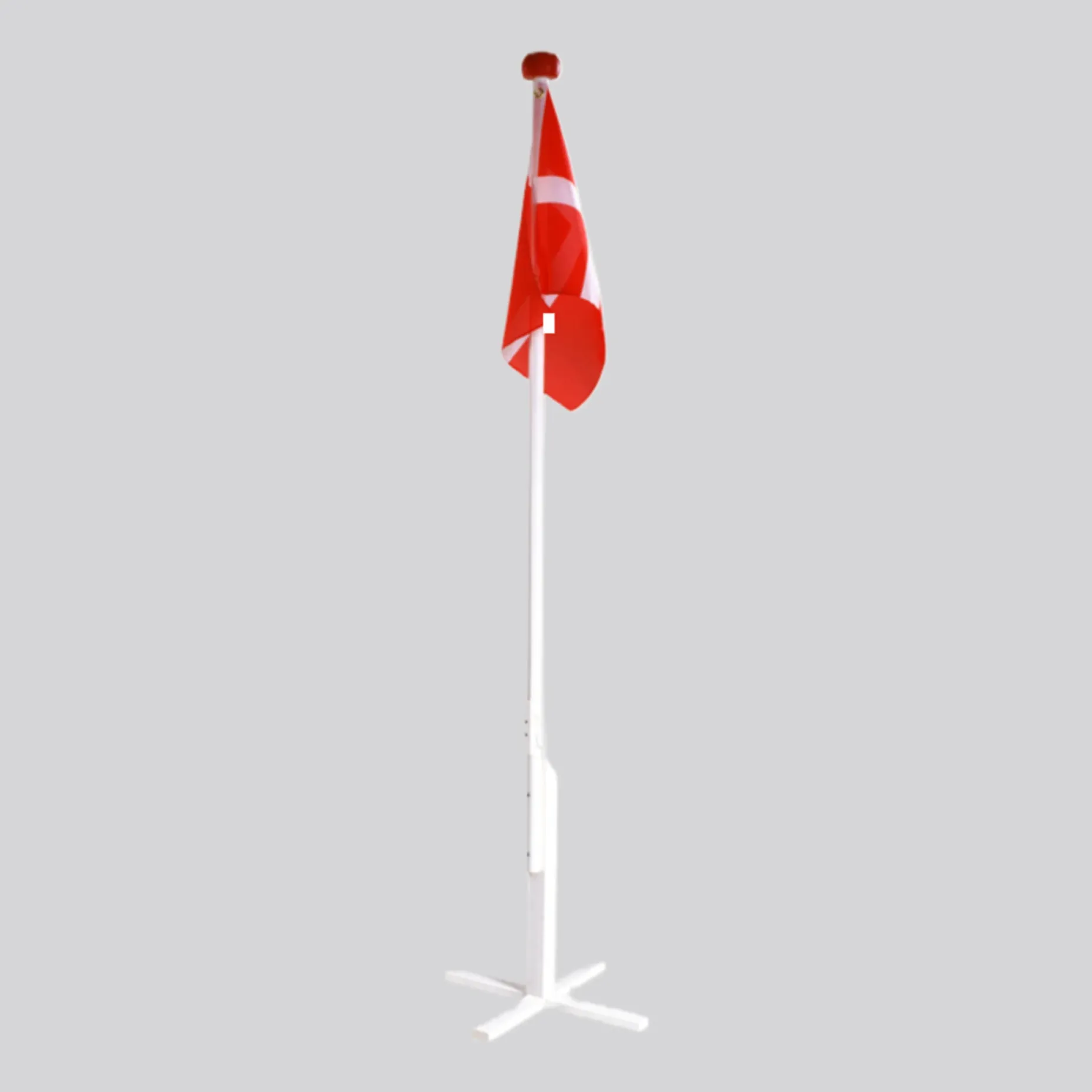 1,8 meter hvidmalet træflagstang på krydsfod leveres med et hejsbart Dannebrogsflag. Flaget er monteret på linen, så du nemt kan hejse og sænke det efter behov.