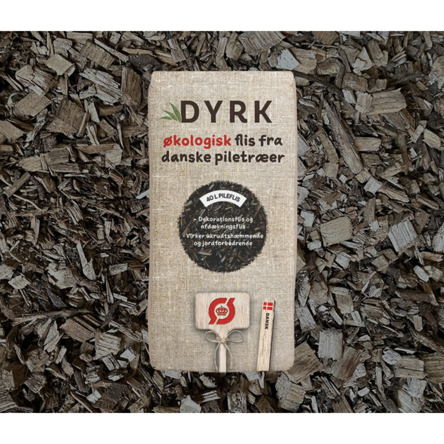 DYRK økologisk pileflis, 40 L, tilfører en varm og naturlig atmosfære til både havebede og krukker. Flisen kan anvendes udendørs og indendørs for at skabe et ensartet, dekorativt lag omkring planter uden at skjule deres visuelle udtryk.