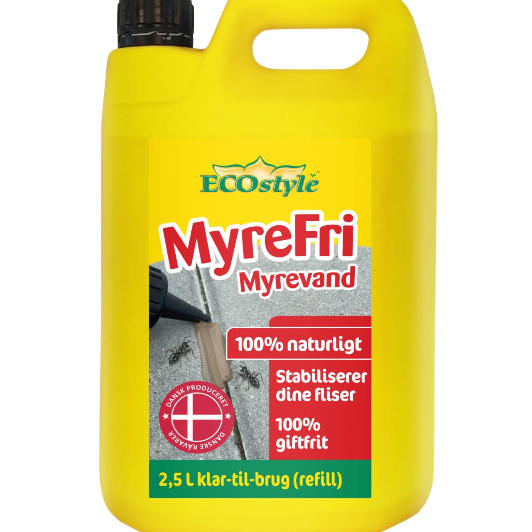 Anvendelse: Hæld MyreFri Myrevand direkte ned i myreboet og omkringliggende myregange og sprækker. Myrevandet trænger ned i myregangene og fylder myreboet med ler, så myrerne forlader deres bo. Når Myrevand tørrer, vil det svinde lidt, så efterfyldning er nødvendigt. Overskydende Myrevand kan nemt vaskes af med vand.