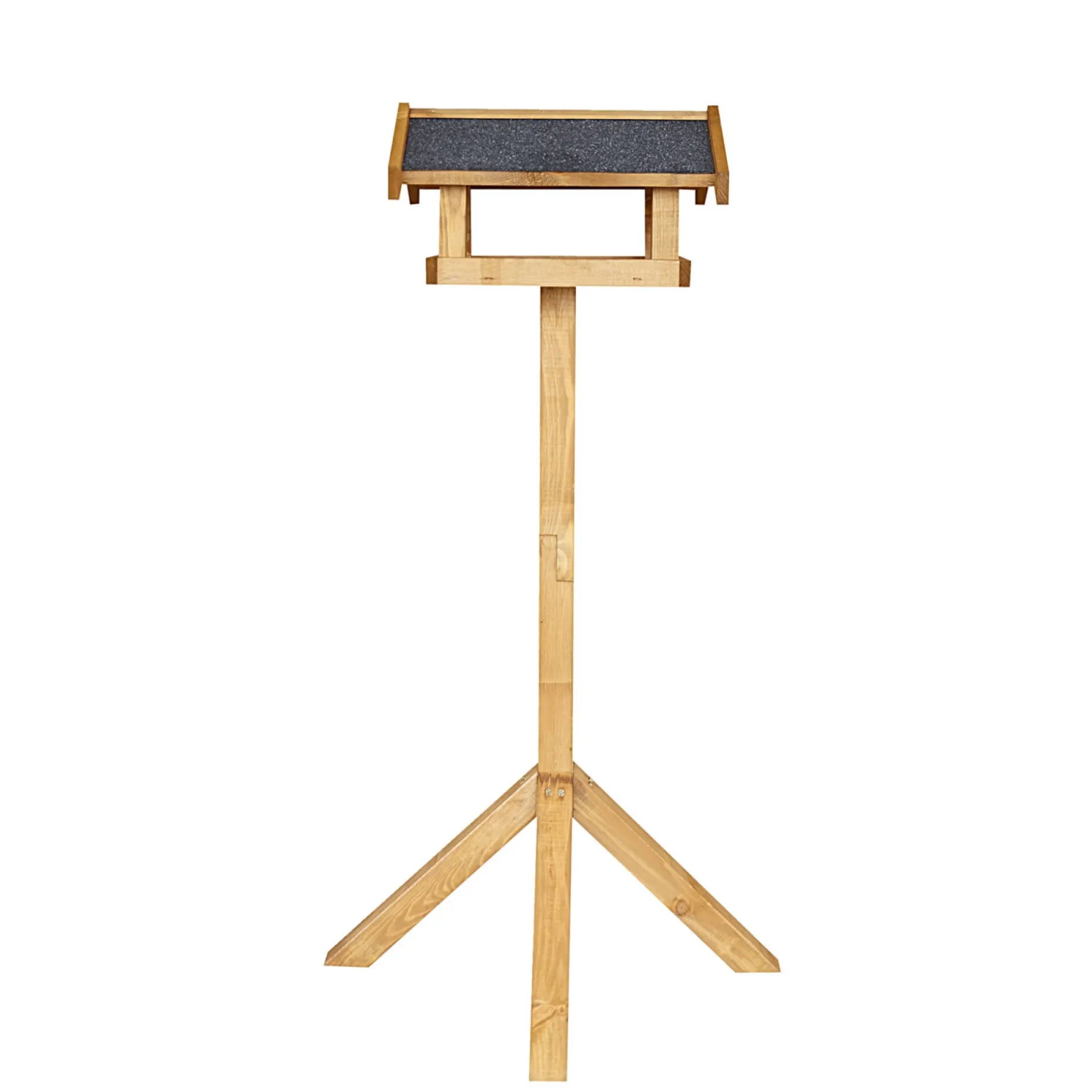 Foderhuset gør det muligt at iagttage fuglene på nært hold uden at forstyrre dem. Standerens højde sikrer en praktisk arbejdshøjde ved genopfyldning, og taget af tagpap beskytter foderet mod nedbør, så det holder bedre i vådt vejr.