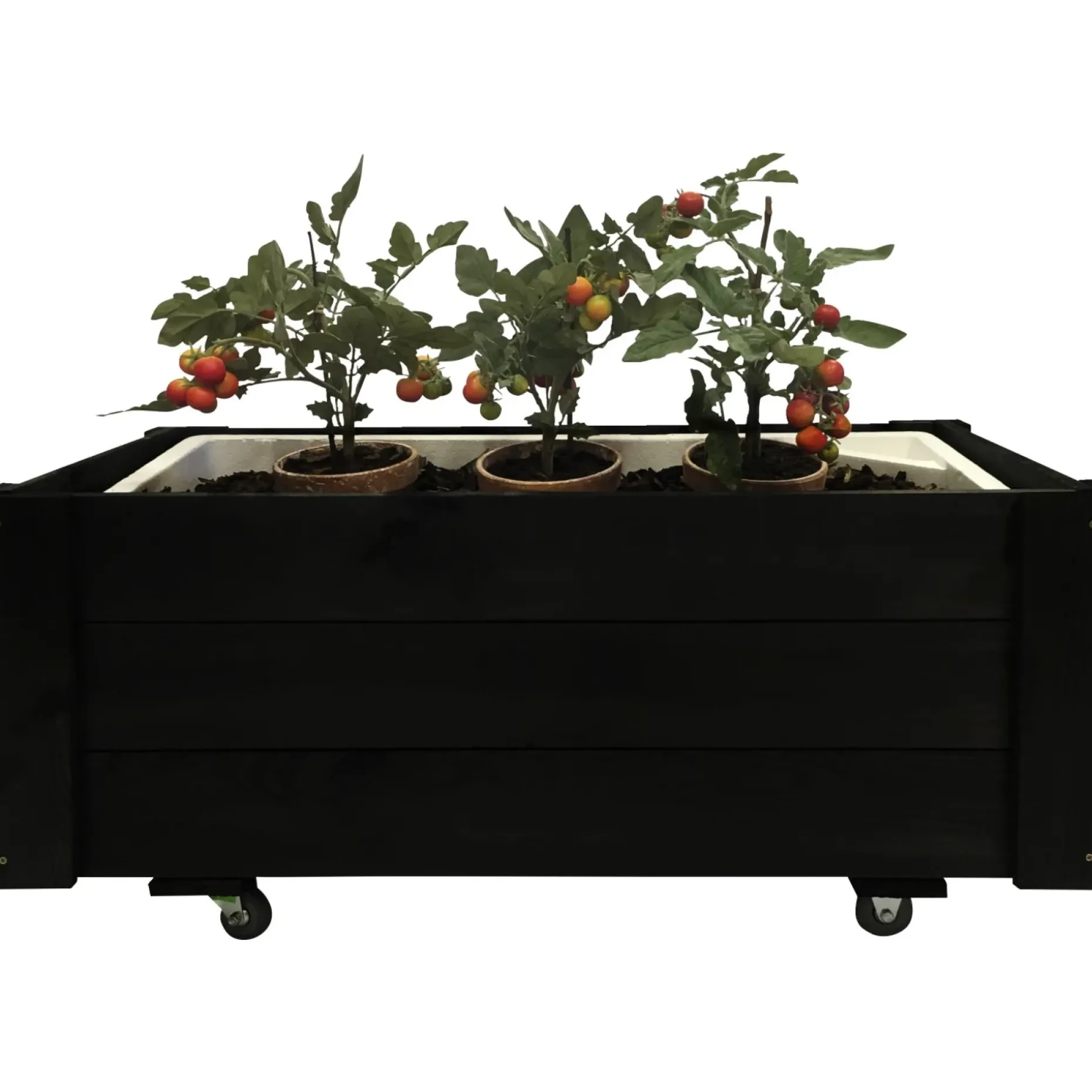 Det enkle design og den sorte grundmaling giver et neutralt, dekorativt udtryk, som fremhæver planterne uden at tage fokus fra dem. De fire hjul gør det muligt at flytte skjuleren efter sollys eller skygge gennem sæsonen.