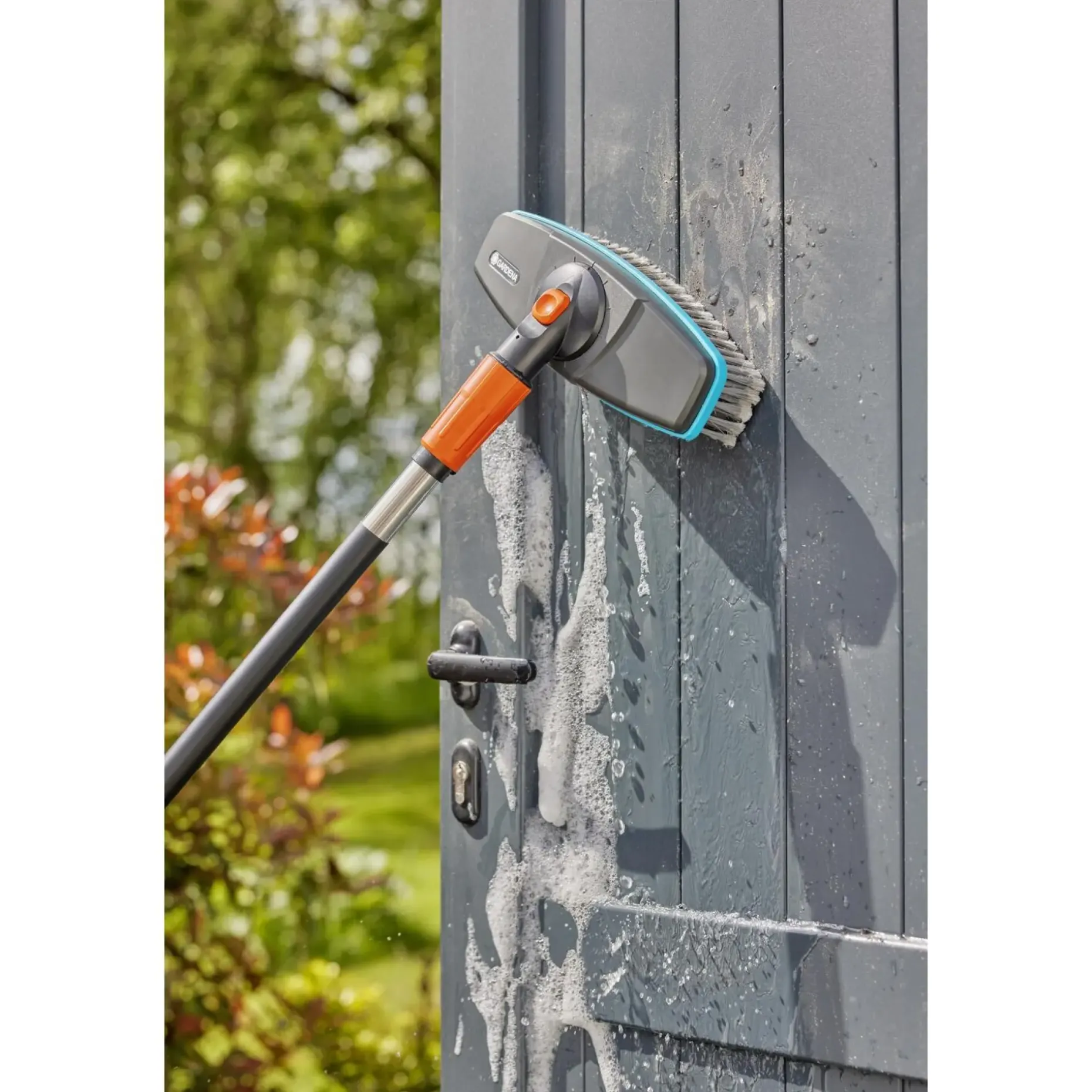 Skaftet tilsluttes vandslangen, så du får kontinuerlig vandtilførsel og sæbe ved rengøring af større flader.