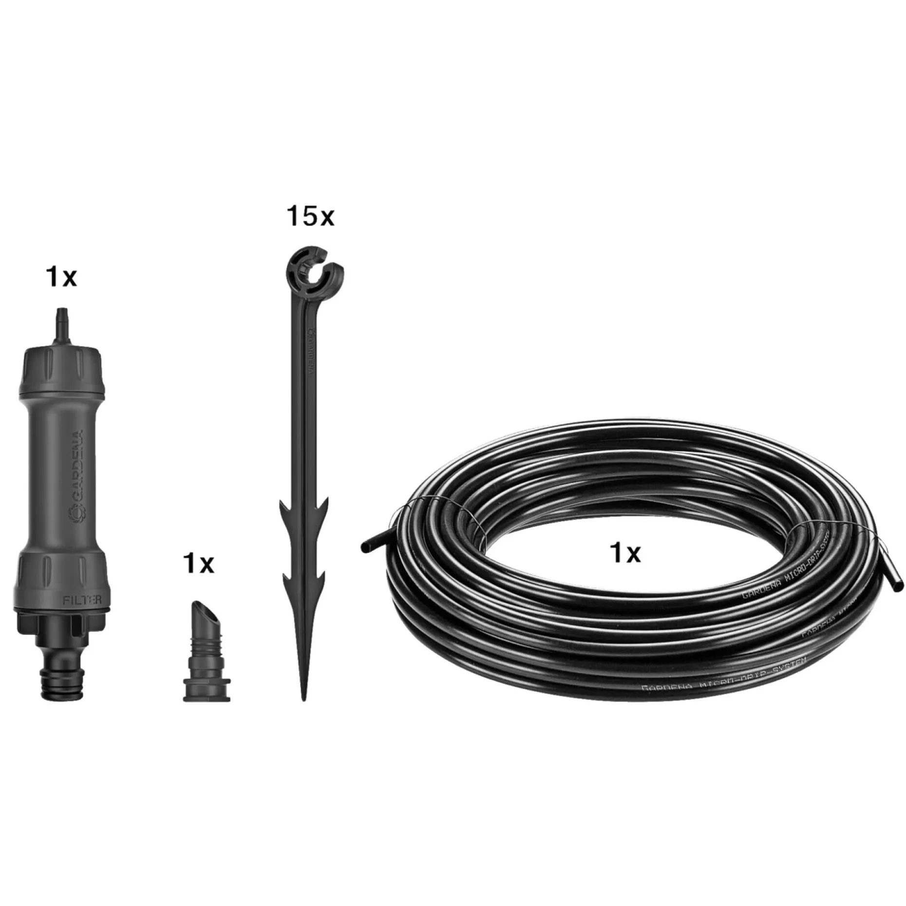 Startsæt til planterækker. Sættet indeholder 1 stk. Micropdrip Basisenhed 1000, 15 mtr. drypslange 4,6 mm og 15 stk. rørholdere. Komponenterne er sammensat til at etablere en enkel drypvandingslinje langs en planterække.