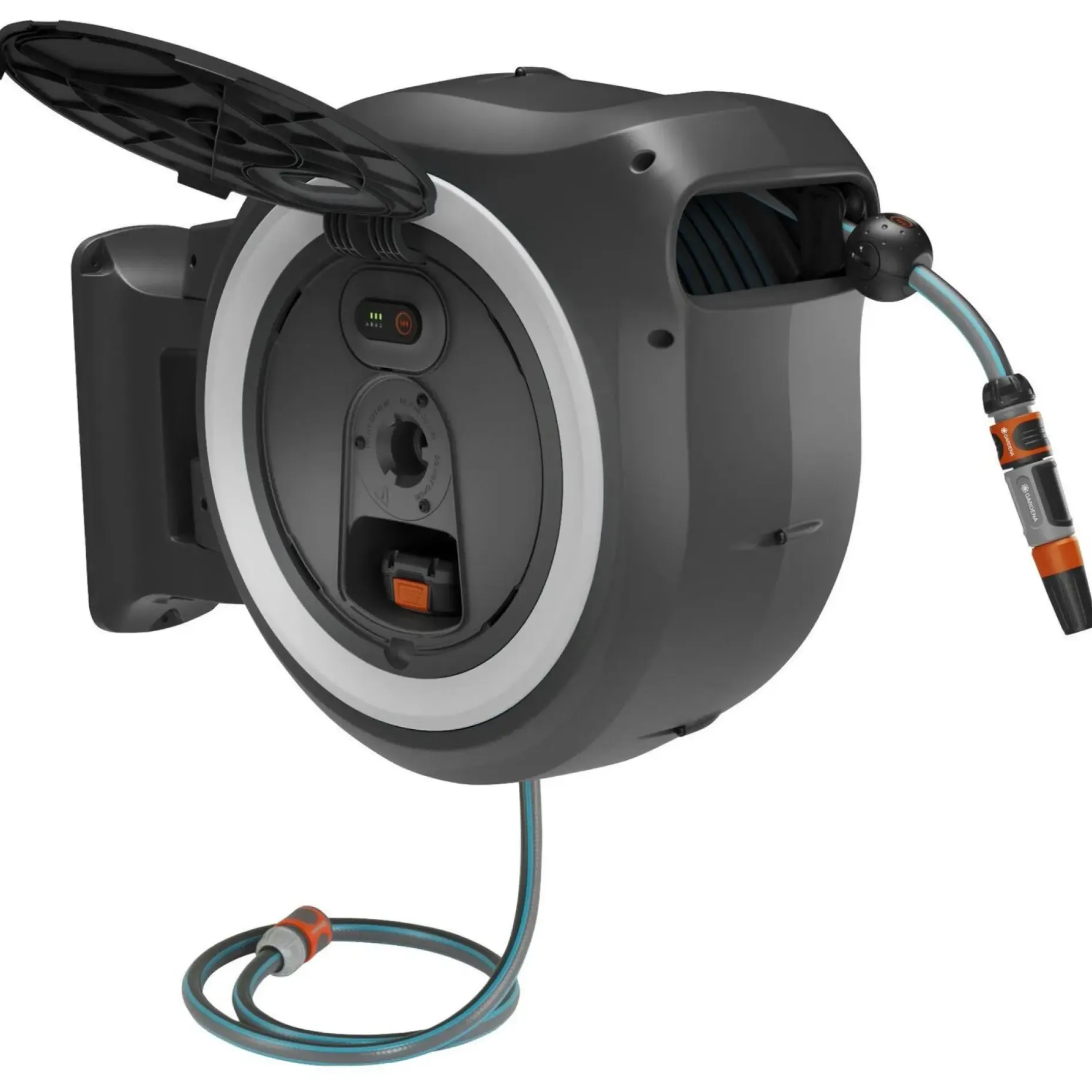 GARDENA PowerRoll XXL er en batteridrevet vægslangeboks med automatisk oprul, der gør vanding enkelt og overskueligt.