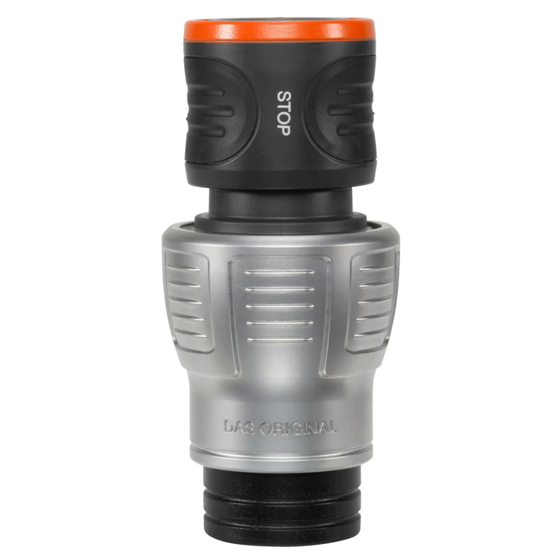 GARDENA Premium slangekobling med vandstop i højkvalitets metalplast-design giver mulighed for let tilslutning og udskiftning af tilbehør ved slangeenden.