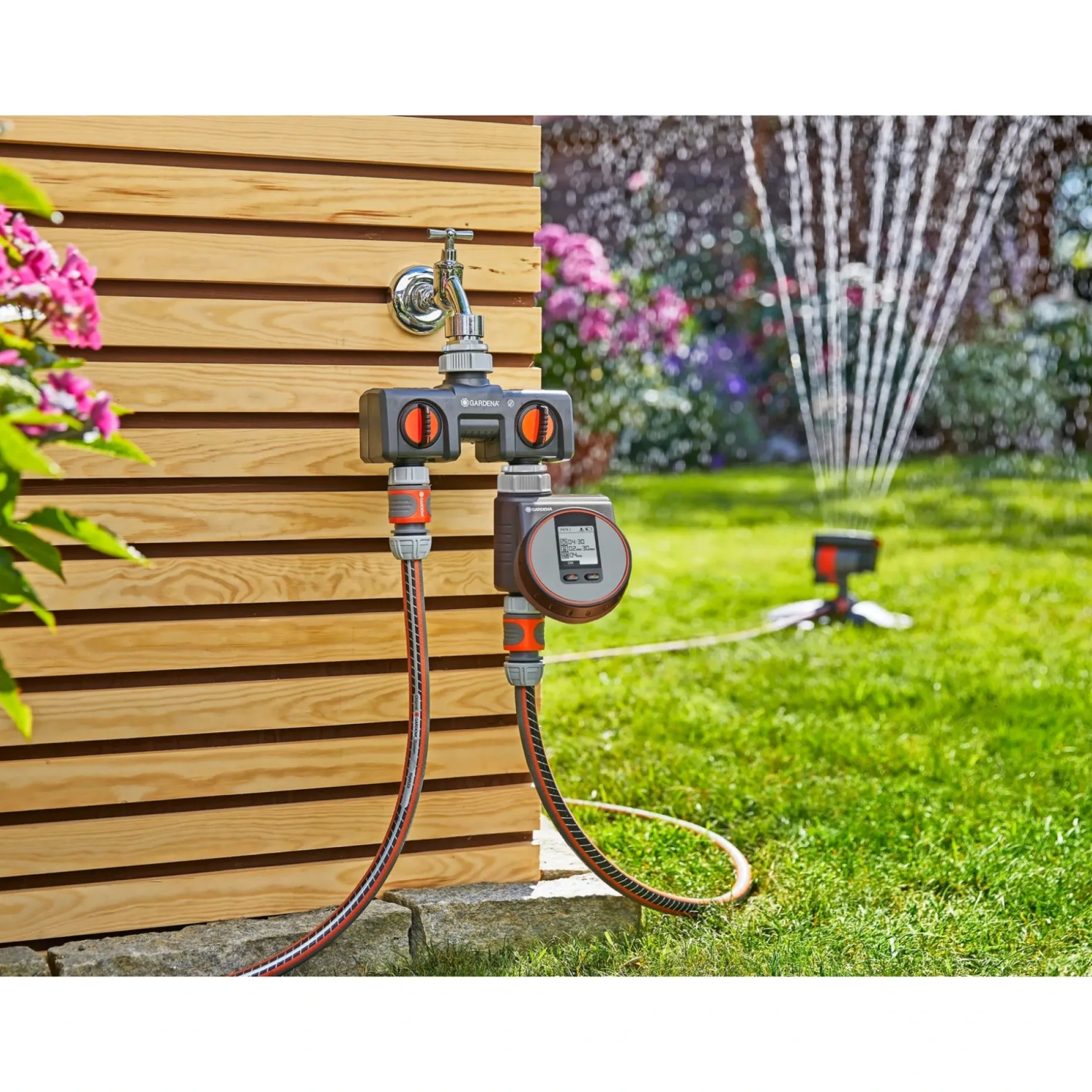 Det betyder, at du kan konfigurere vandingsopsætninger med to udgange, justere flow til forskellige planter eller værktøjer og hurtigt lukke for vandet ved behov. Der kan tilsluttes både redskaber og vandingscomputere samtidigt for fleksibel styring.