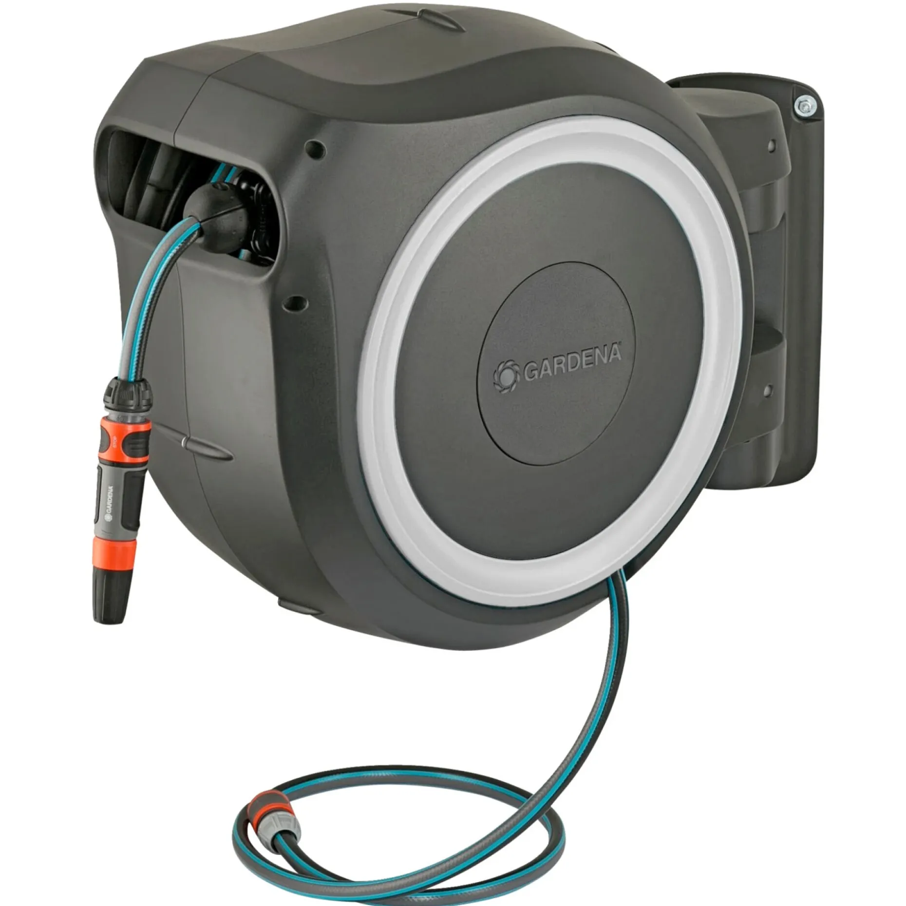 Den vægmonterede løsning ruller automatisk en 30 meter haveslange op ved hjælp af en integreret stålfjeder, så du undgår sammenfiltring og beskidte hænder.