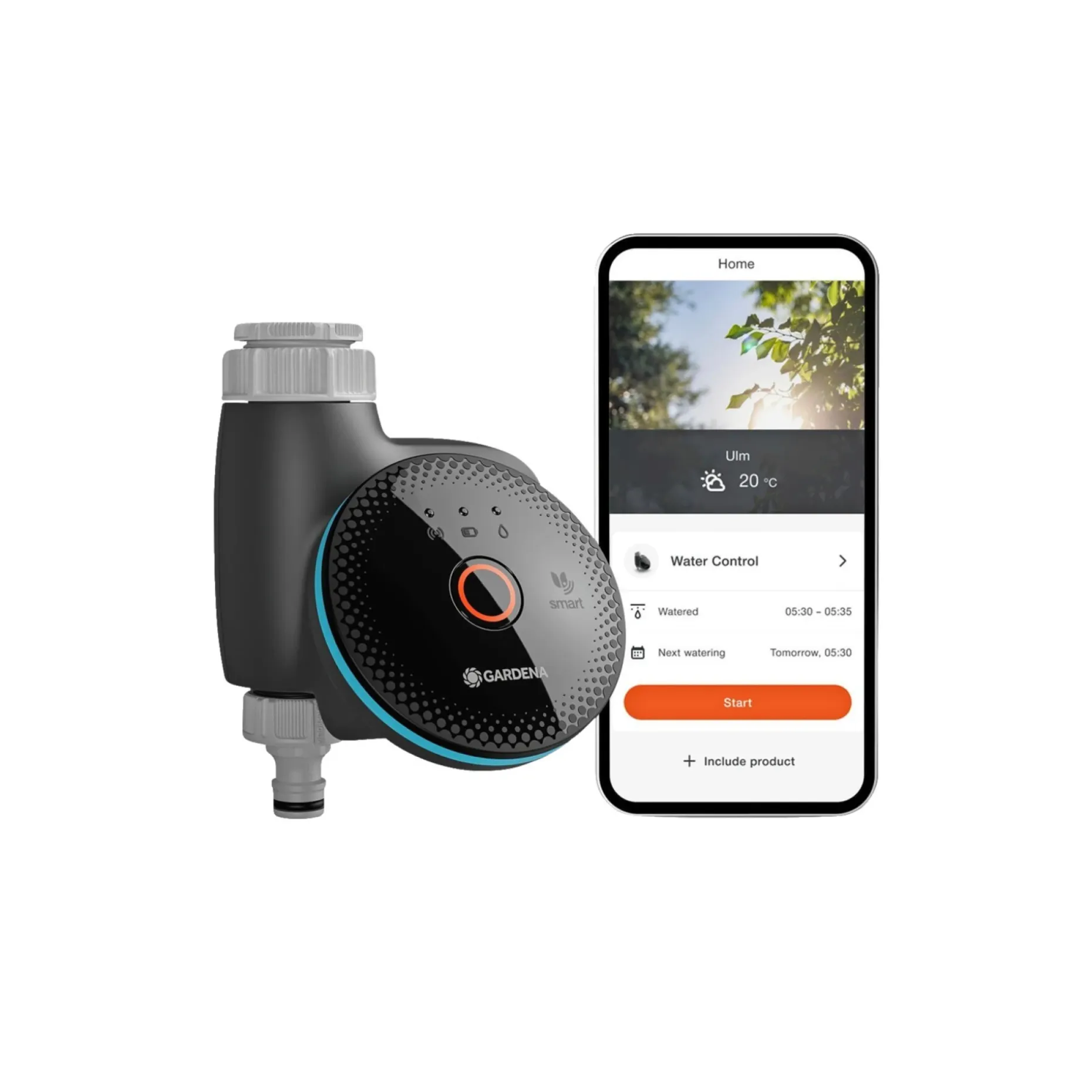Fjernbetjening via GARDENA Smart app eller knap til manuel vanding. Appen kan være GARDENA Smart app eller GARDENA Bluetooth app, som er gratis at downloade. Styring er tilgængelig fra smartphone, tablet eller web, men kræver smart gateway, Wi-Fi-router og internetadgang samt en smartphone, tablet eller PC.