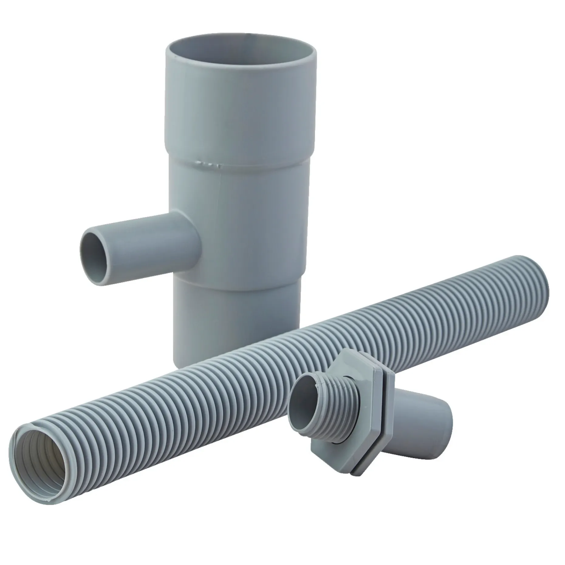 GROUW startkit til regnvandstønde indeholder de nødvendige dele til at etablere en sikker forbindelse mellem nedløbsrør og regnvandstønde. Sættet leveres med en nedløbsventil til 75 mm tagrender med overløbsikring, en monteringsstuds samt en 40 cm flexslange. Komponenterne er fremstillet i grå plast, hvilket giver et neutralt og diskret udseende.
