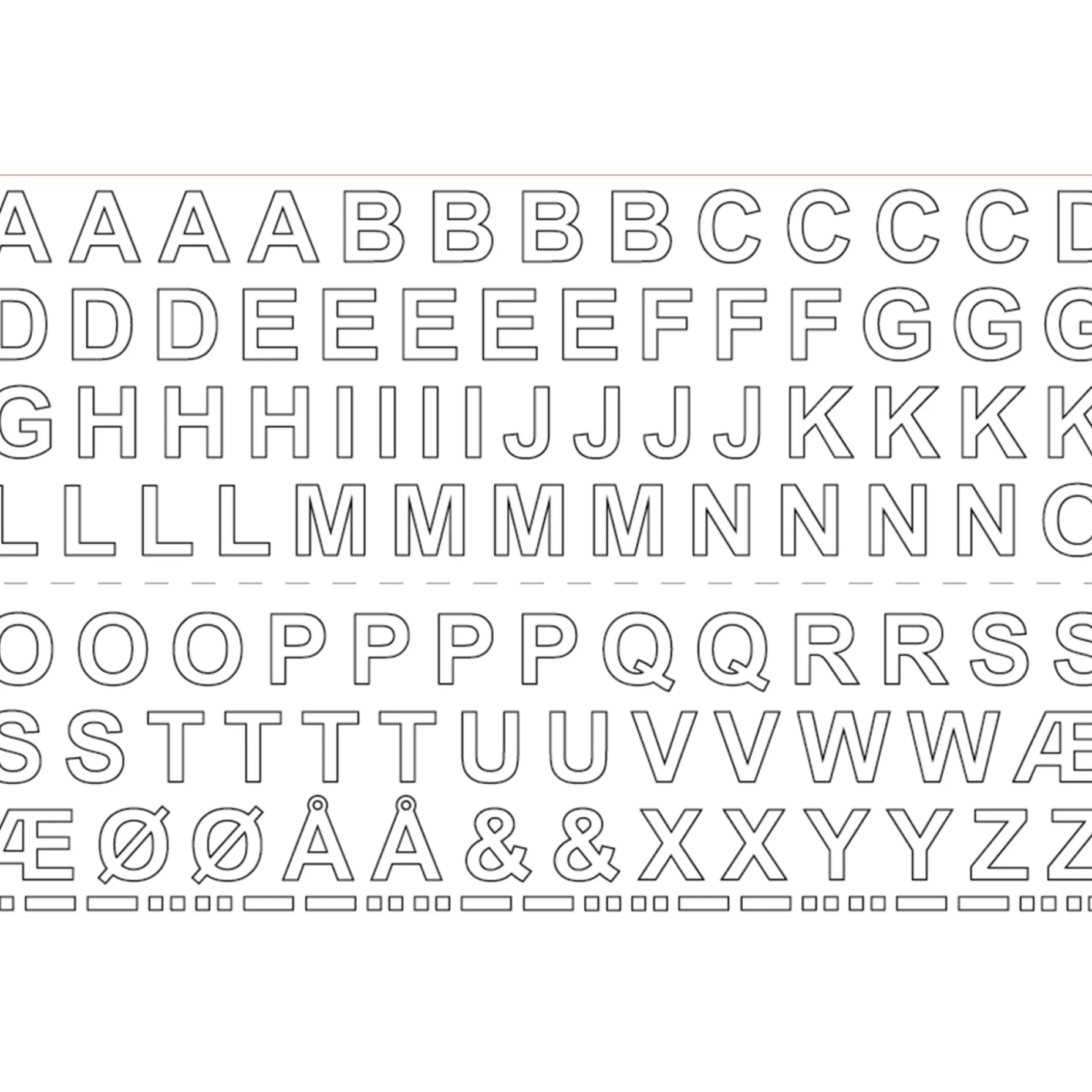 Arkene indeholder alfabetet fra A til Ø samt komplette talark, så du kan sammensætte præcise navne og husnumre uden at mangle tegn. Kombinationen af bogstaver og tal gør det enkelt at tilpasse skilte ved flytning eller ændring af husholdningsoplysninger.