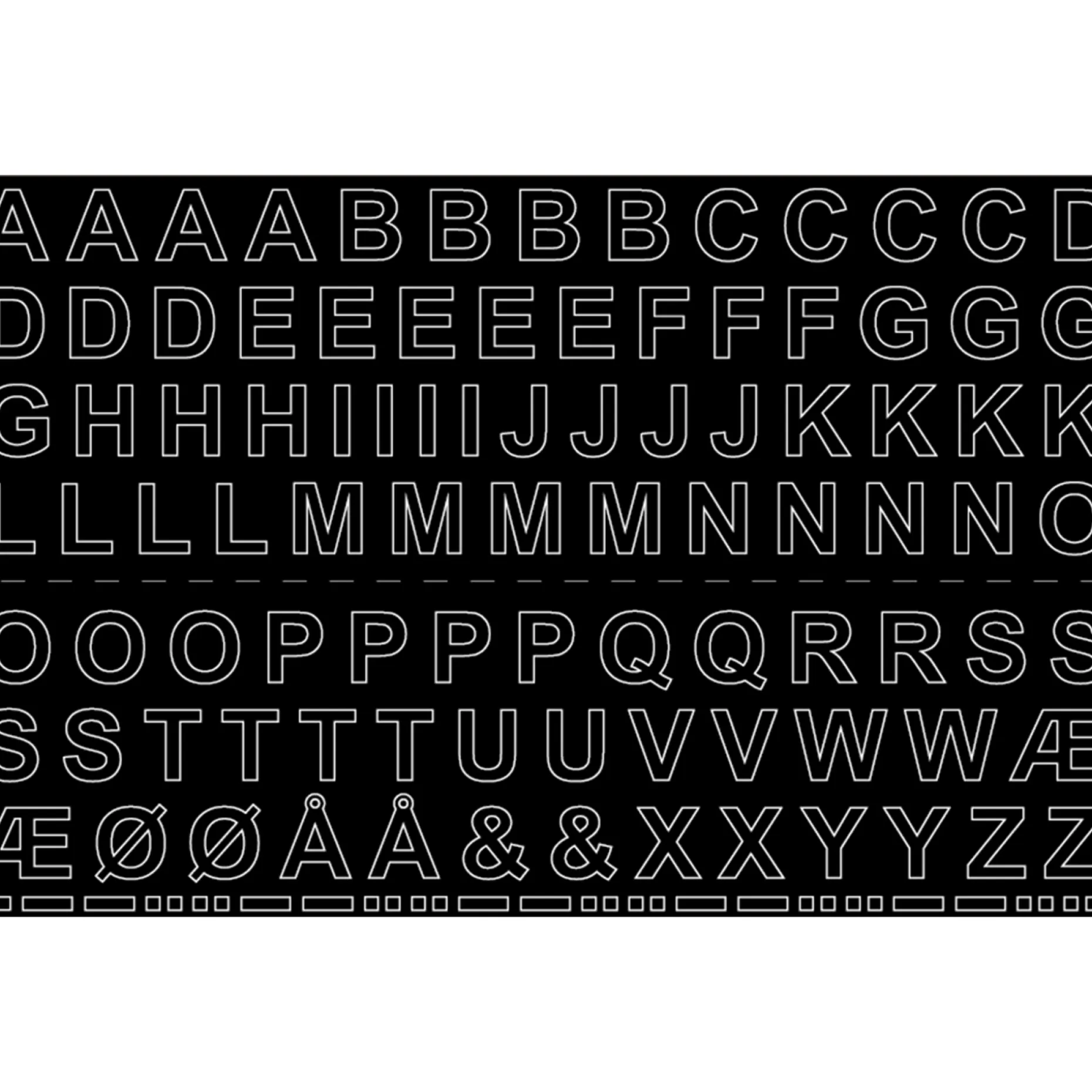 - Pakke med 3 ark tal 0-9 og 1 ark bogstaver og tegn