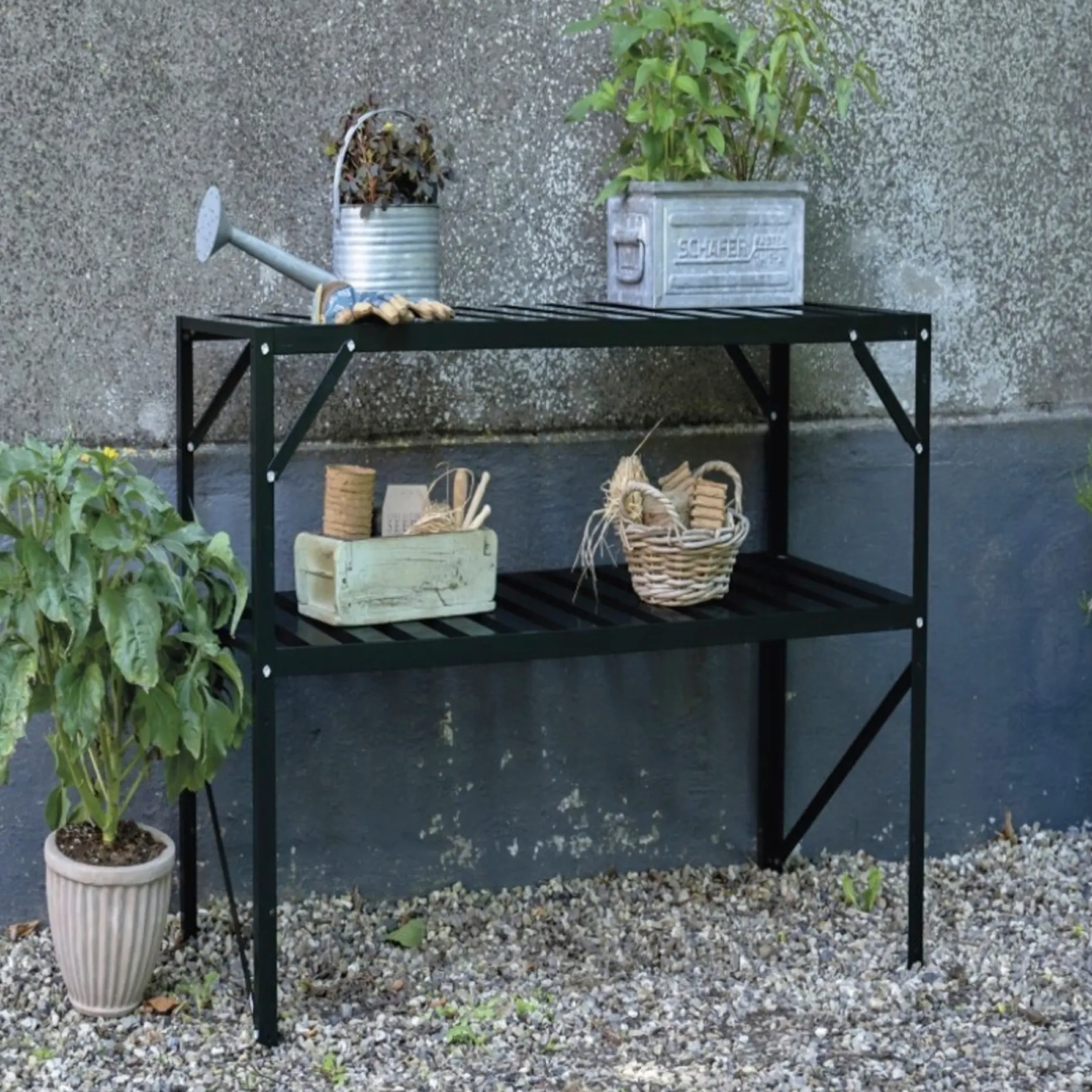 Det fritstående Halls alu-bord med hylde i let, stabilt og sort aluminium skaber straks struktur i dit drivhus. Uanset om du sår, prikler, ompotter eller sorterer.