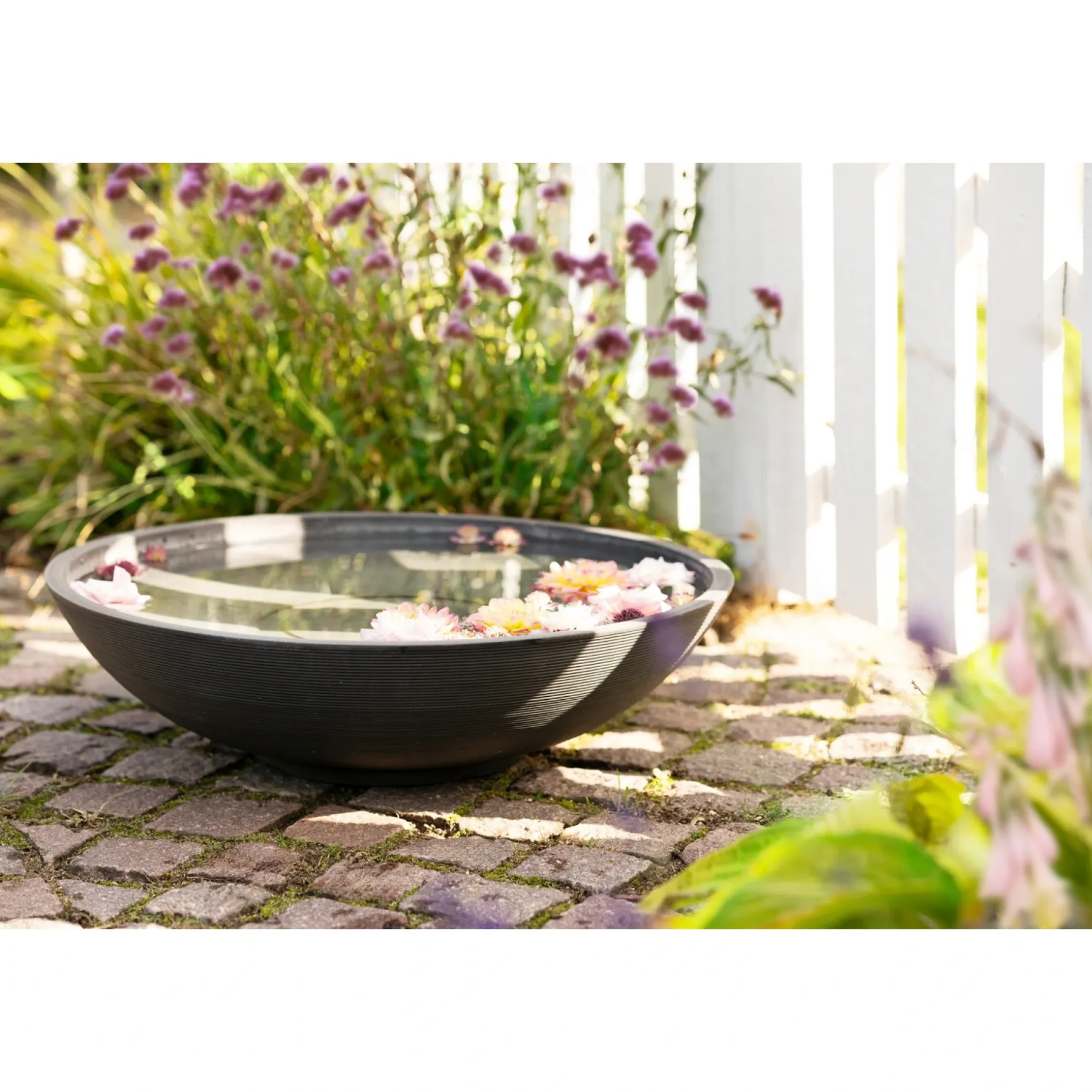 Du kan fylde bassinet med vand og blomster for et dekorativt fokuspunkt, eller bruge det som plantekasse til større potter eller direkte beplantning. Den brede overflade fremhæver reflekteret lys og giver en elegant effekt omkring havemøbler, mens kanten kan pyntes med flydende dekorationer eller planter for variation.