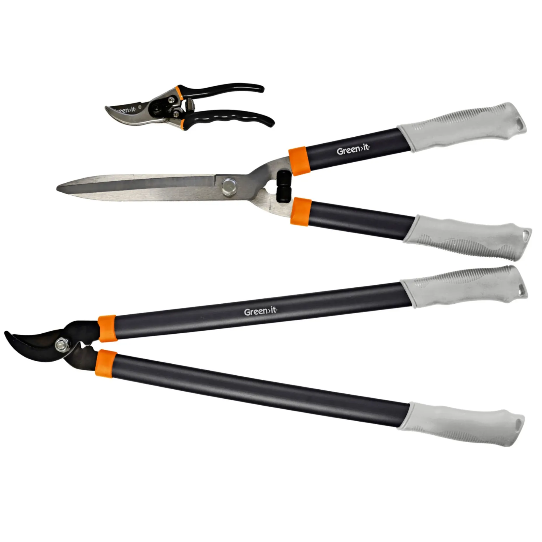 - Sættet består af 3 dele: grensaks, hækkesaks og beskærersaks