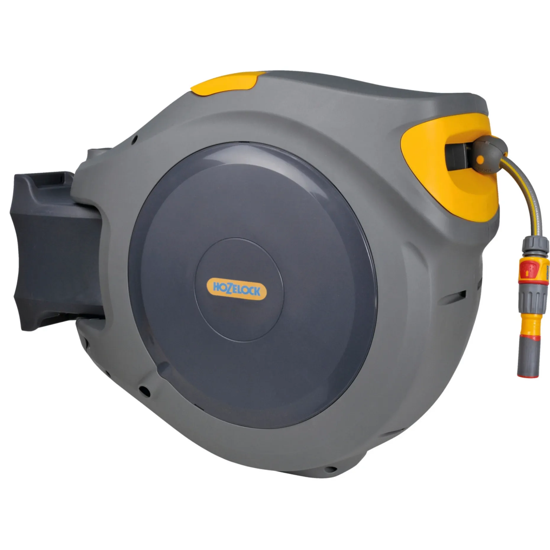 En kraftfuld fjeder ruller automatisk slangen op uden knæk, knuder eller besvær. Vægmonteret med 180-graders drejning, så du kan nå ud i hvert hjørne af haven.