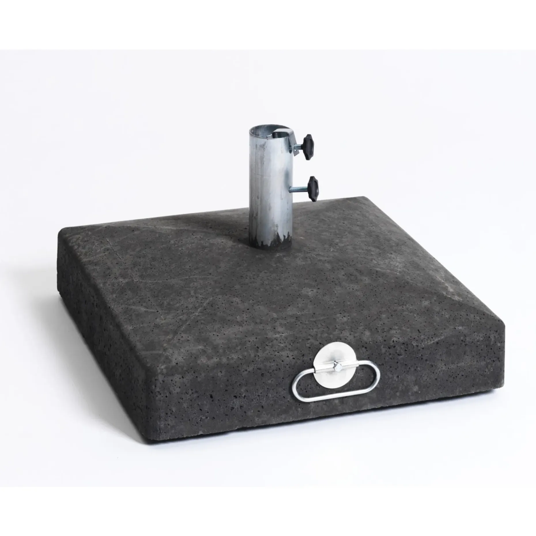 Parasolfod i sort beton med hjul og håndtag.