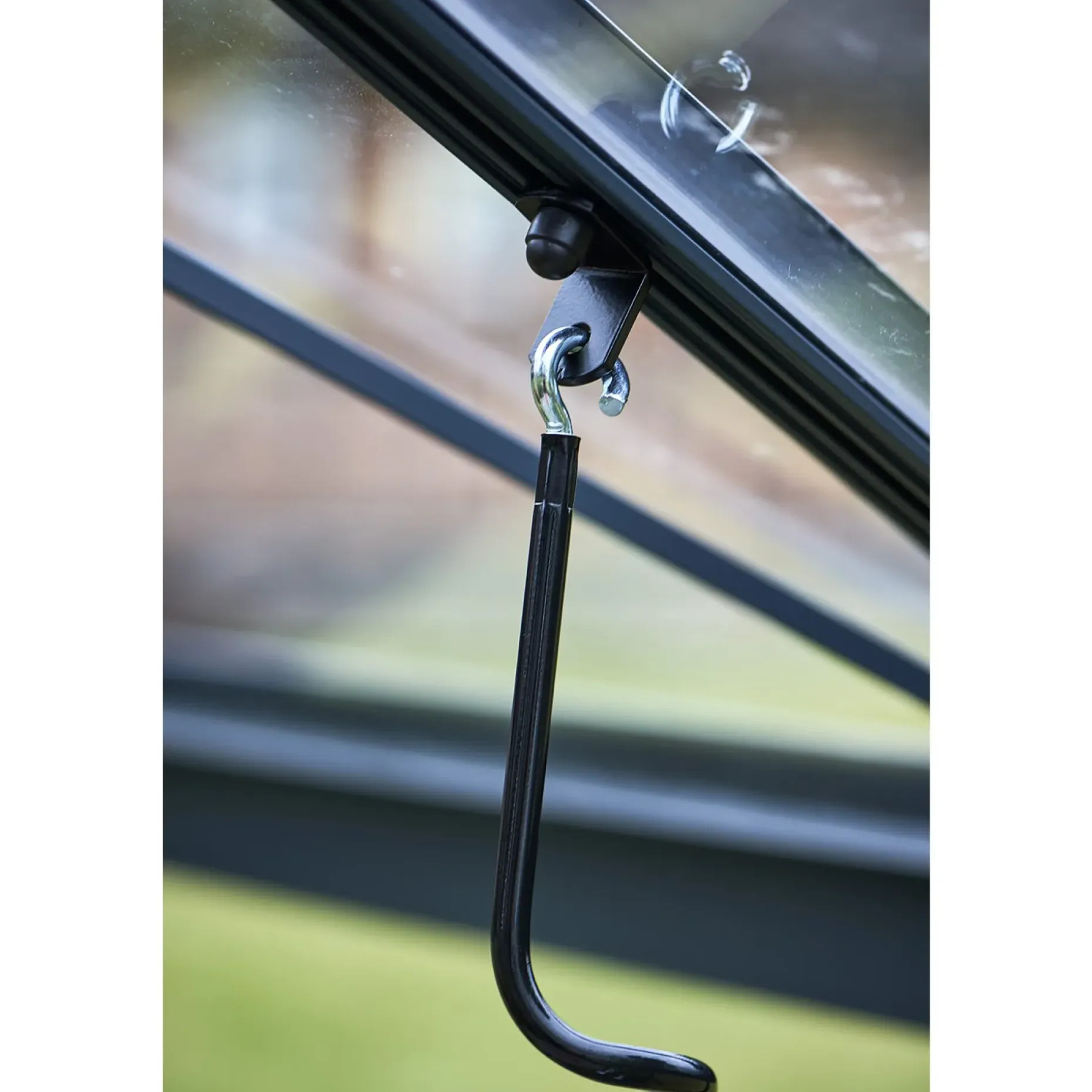 Vinklerne i aluminium (sort) fastgøres i drivhusets profilspor. Her hægtes fx. plantespiraler på.