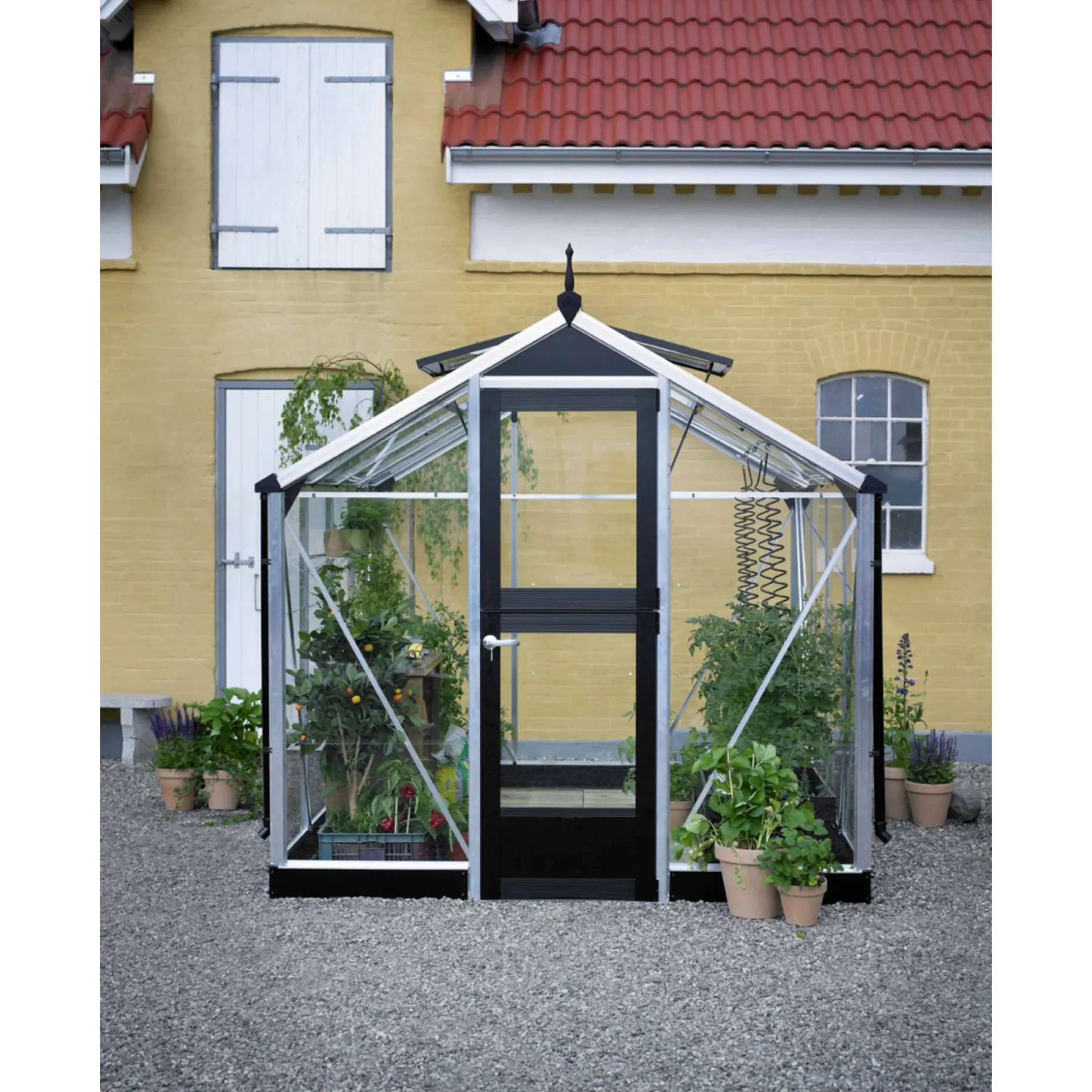 Drivhuset er udviklet i et nyt profilsystem, så du dermed får et drivhus med mange lækre detaljer. Husets stalddør, tagvinduerne og beslagene er alle sorte med aluprofiler, hvilket giver drivhuset et unikt design og udseende, som ikke ses ved andre traditionelle drivhuse. Du får dermed et specielt drivhus, der vil passe flot ind i enhver have.