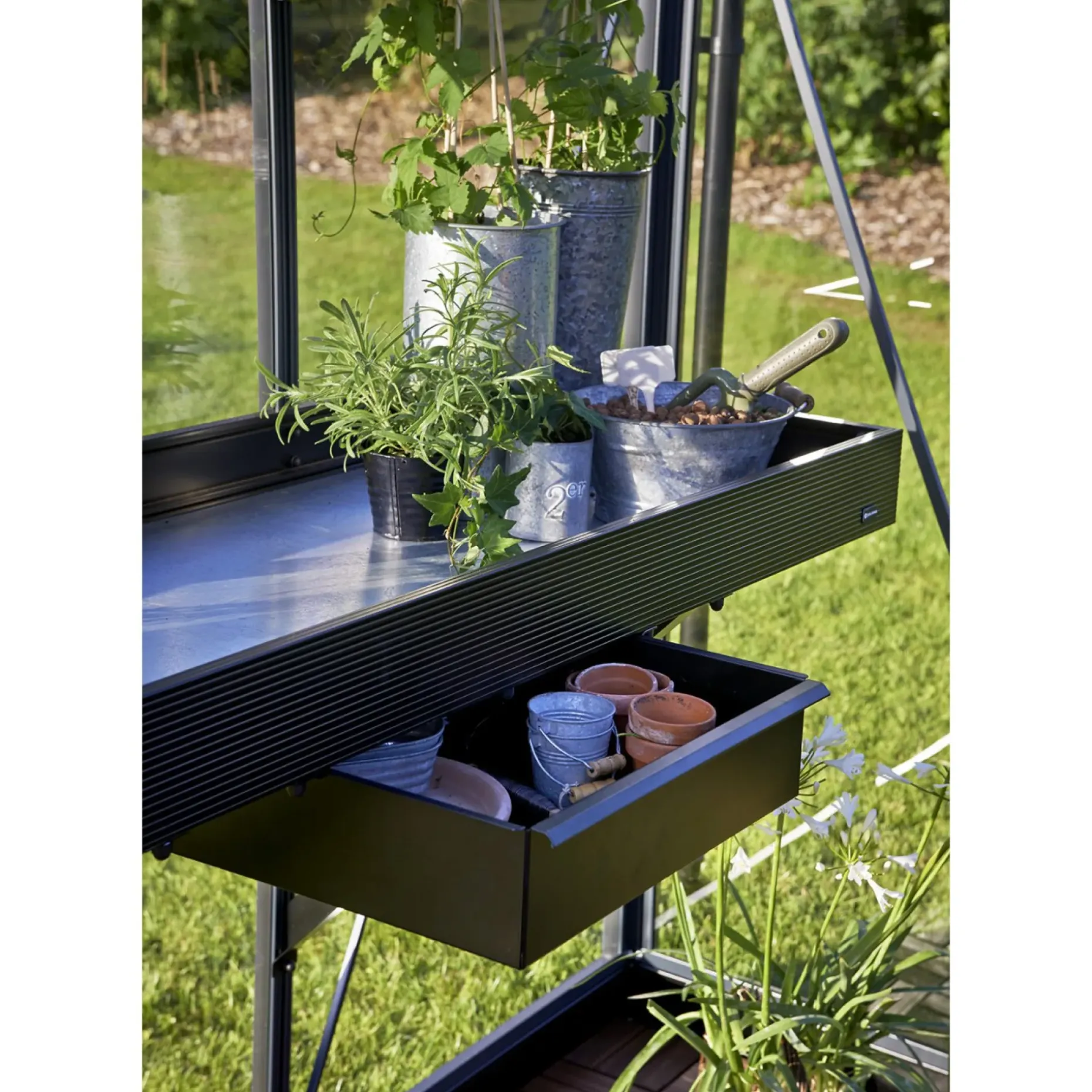 Dette smarte plantebord er integreret direkte i juliane drivhuset, så det tager mindst muligt plads. Det giver et ideelt sted til opbevaring af spirrende planter, krukker og lignende. Plantebordet er udformet med en høj kant, hvorved krukker og andre skrøbelige ting ikke umiddelbart kan vælte ned og gå i stykker.