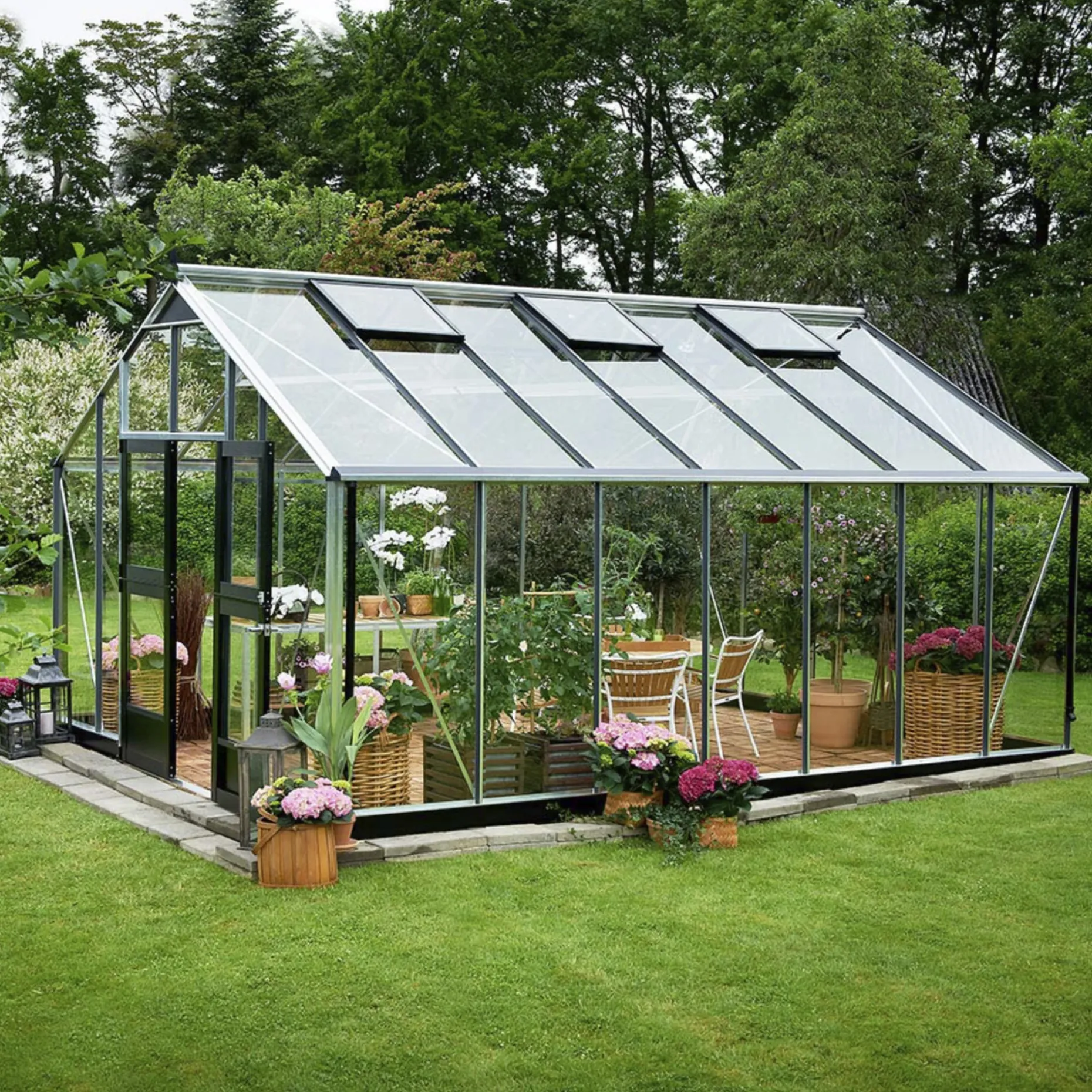 I dette drivhus er der plads til det hele. Så der er masser af plads til at dyrke diverse planter, og endda samtidig have et sæt havemøbler stående, til når benene skal hviles, eller kaffen nydes. Du kan også benytte drivhuset som en udestue, hvor du kan holde middag, når venner og familie kommer på besøg. Der er plads, til lige hvad hjertet end måtte begære.