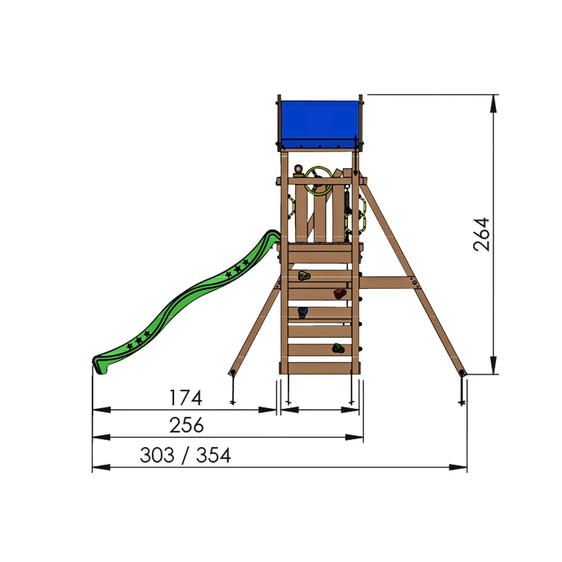 Inklusiv klatrevæg, klatresten, 2×2-trin stige, håndgreb, jordankre, bor/skruer, beslag, skruebeskyttere, presenningstag, stjernekikkert, rat, Jungle Gym flag, gyngestativ med et gyngesæde og en trapezgynge, blå rutsjebane 220 cm, hovedbeskytter, sandkasse samt manual.