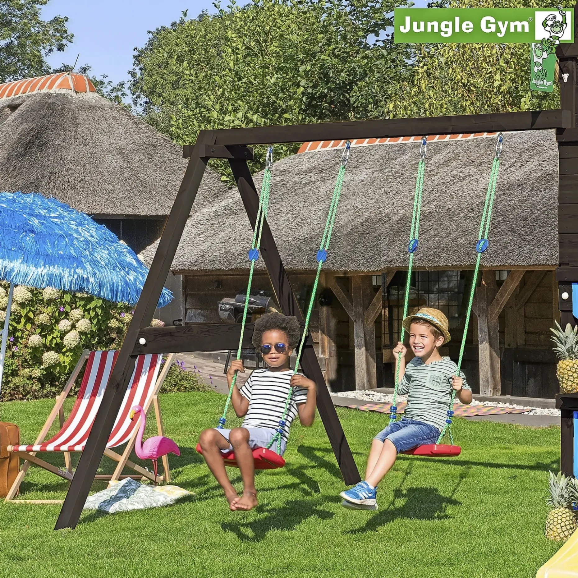 En sikker favorit til udendørs leg er gynge modulet Jungle Gym Swing Modul x’tra, og som har plads til to unge opdagelsesrejsende. Der medfølger to gyngesæder i pakken. Swing Modul x’tra er en spændende tilføjelse til ethvert legetårn, og børnene kan simpelthen bruge timer på netop denne aktivitet. Gyngestativer ansporer til naturlig leg og opmuntrer børnene til at bevæge sig aktivt og jævnligt. Denne udgave bliver leveret malet i en flot sort farve. Træet er tørret ned inden det males med træbeskyttelse. Farven er grundmalet med vandig træbeskyttelse. Passer til følgende af Jungle Gyms legetårne: Castle, Club, Home, Hut, Cottage, Cubby, Shelter, Cabin, Lodge, Villa, Chalet, Fort, Mansion, Farm, Barn, Palace, Playhouse L, Playhouse XL og Crazy Playhouse XL. Legetårnet består af fyrretræ der er grundmalet i sort farve som passer godt til en hver have. Testet og overvåget for kvalitet og sikkerhed (i henhold til EN: 71-1, 2, 3, 8 & 9) CE godkendt. Modulet leveres som komplet saml-selv-pakke i færdigsavede trælængder.