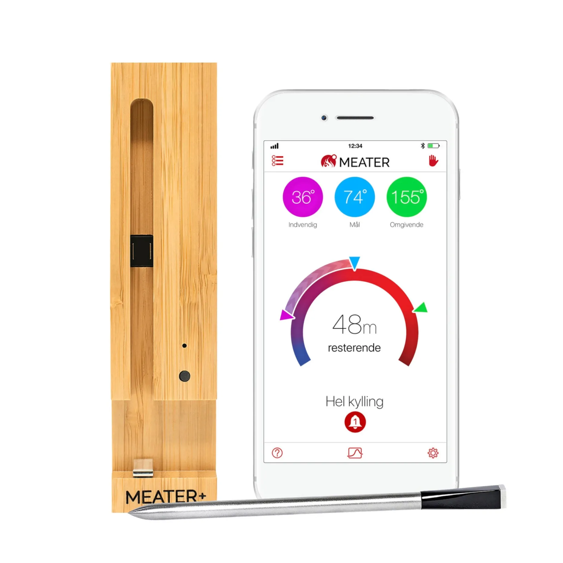MEATER PLUS sørger for, at du kan lave mad til perfektion, selvom du ikke er professionel kok. Og du behøver ikke engang holde øje med maden hele tiden. Når kødet er klar, får du besked på din smartphone. Det trådløse stegetermometer fungerer perfekt i ovnen, på grillen, i køkkenet, i en rygeovn eller i et rotisseri, og endda til dit bagværk. Du kan forbinde den med Bluetooth (op til 50 meter) eller via MEATER Link over Wi-Fi gennem App’en.