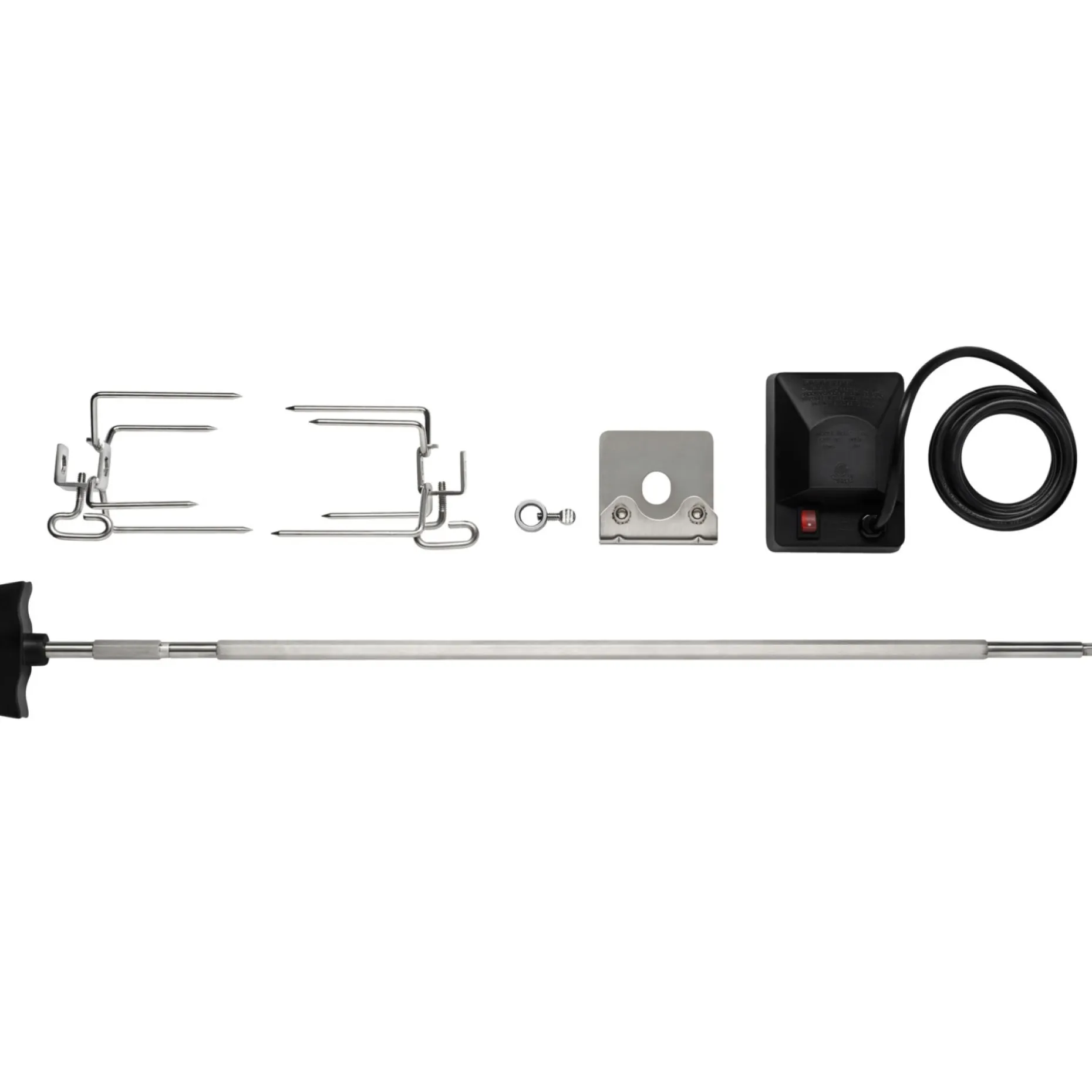Sættet indeholder en kraftig motor med 1,8 m ledning og et rotisserispyd i rustfrit stål med Ø 8 mm og længde 64,5 cm.