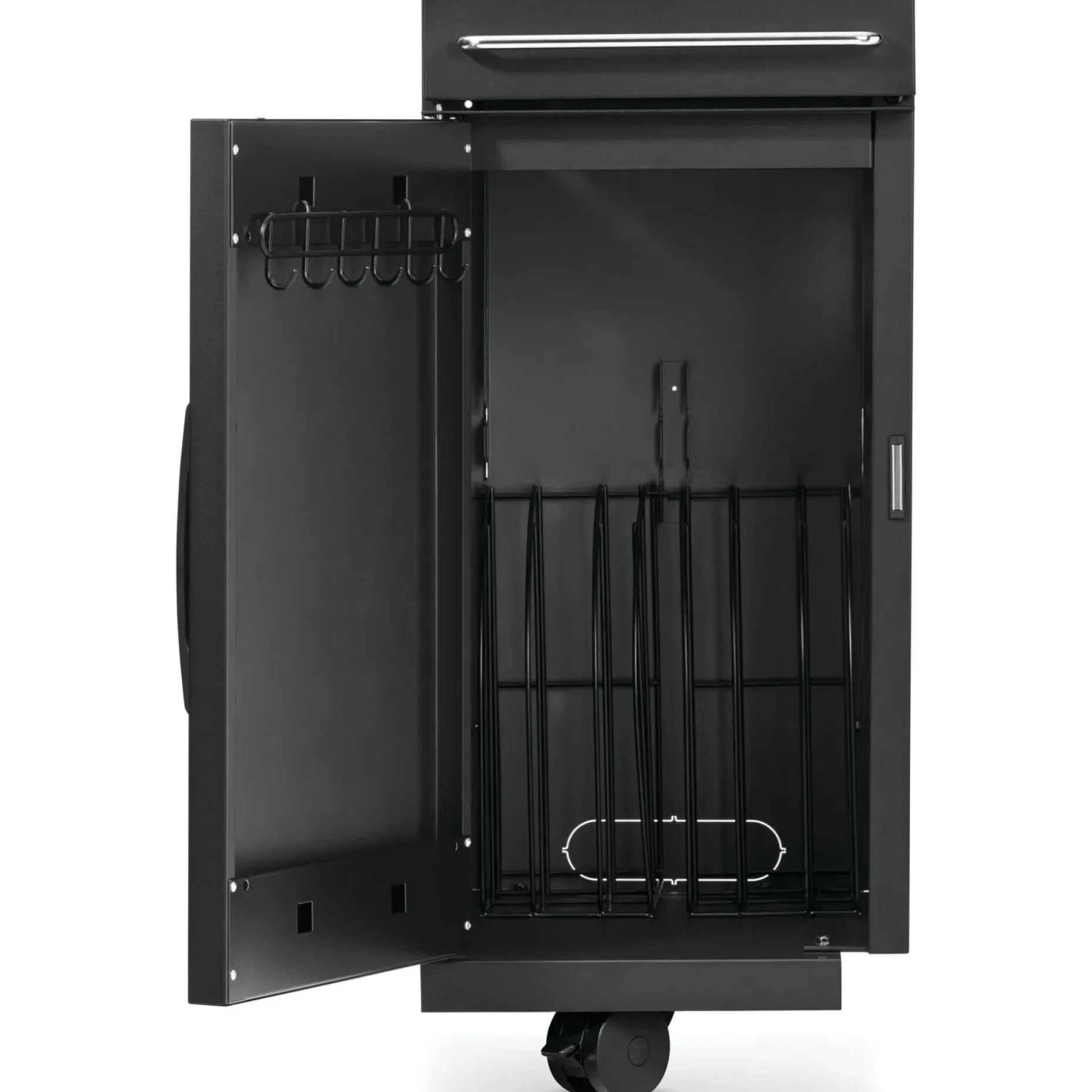 Kabinet giver ekstra plads og orden i dit udekøkken og gør det lettere at arbejde ved grillen. Den elegante matsorte overflade giver et ensartet og moderne udtryk. Udtræksskuffen beskytter små redskaber mod snavs, og kroge sikrer hurtig adgang til værktøj. Integrerede hjul gør det enkelt at omrokere efter behov.
