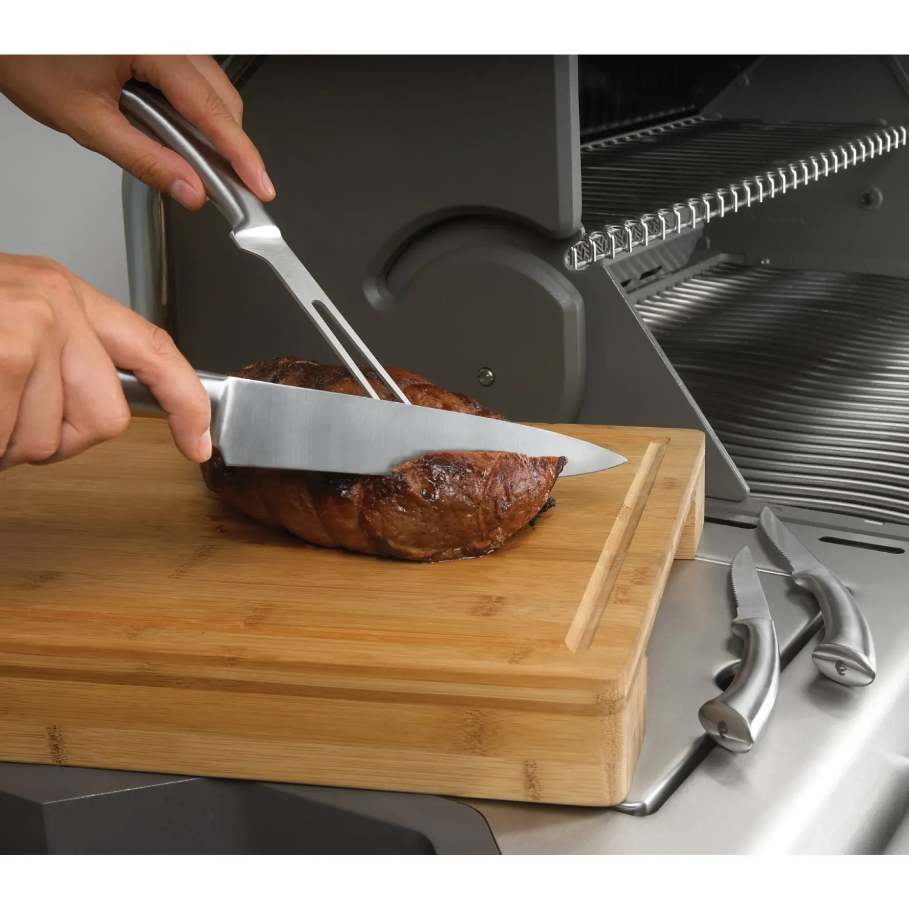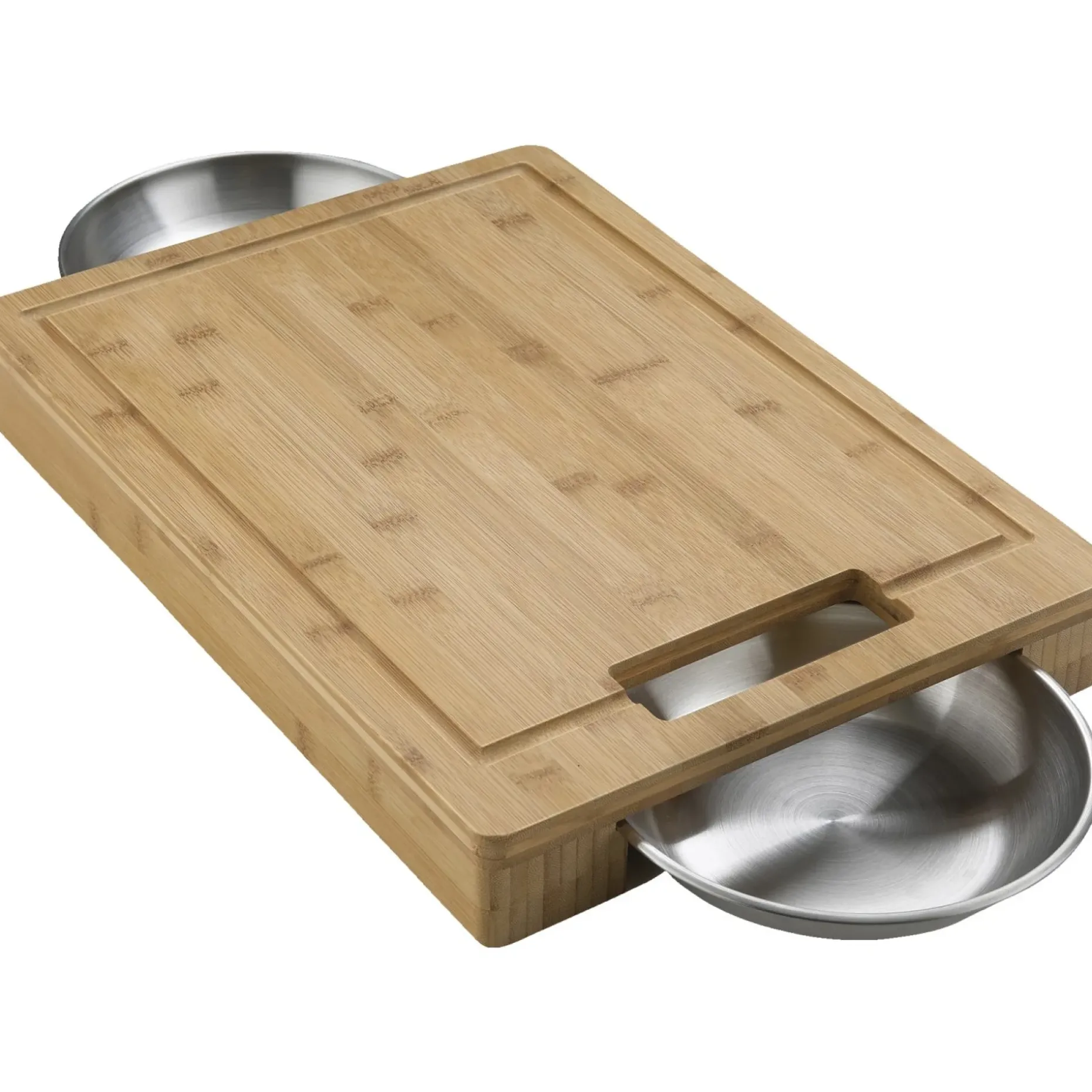 De indbyggede rustfrie skåle gør det nemt at samle kødsaft eller snittet grønt direkte i skålen, så saft ikke spreder sig på bordet.