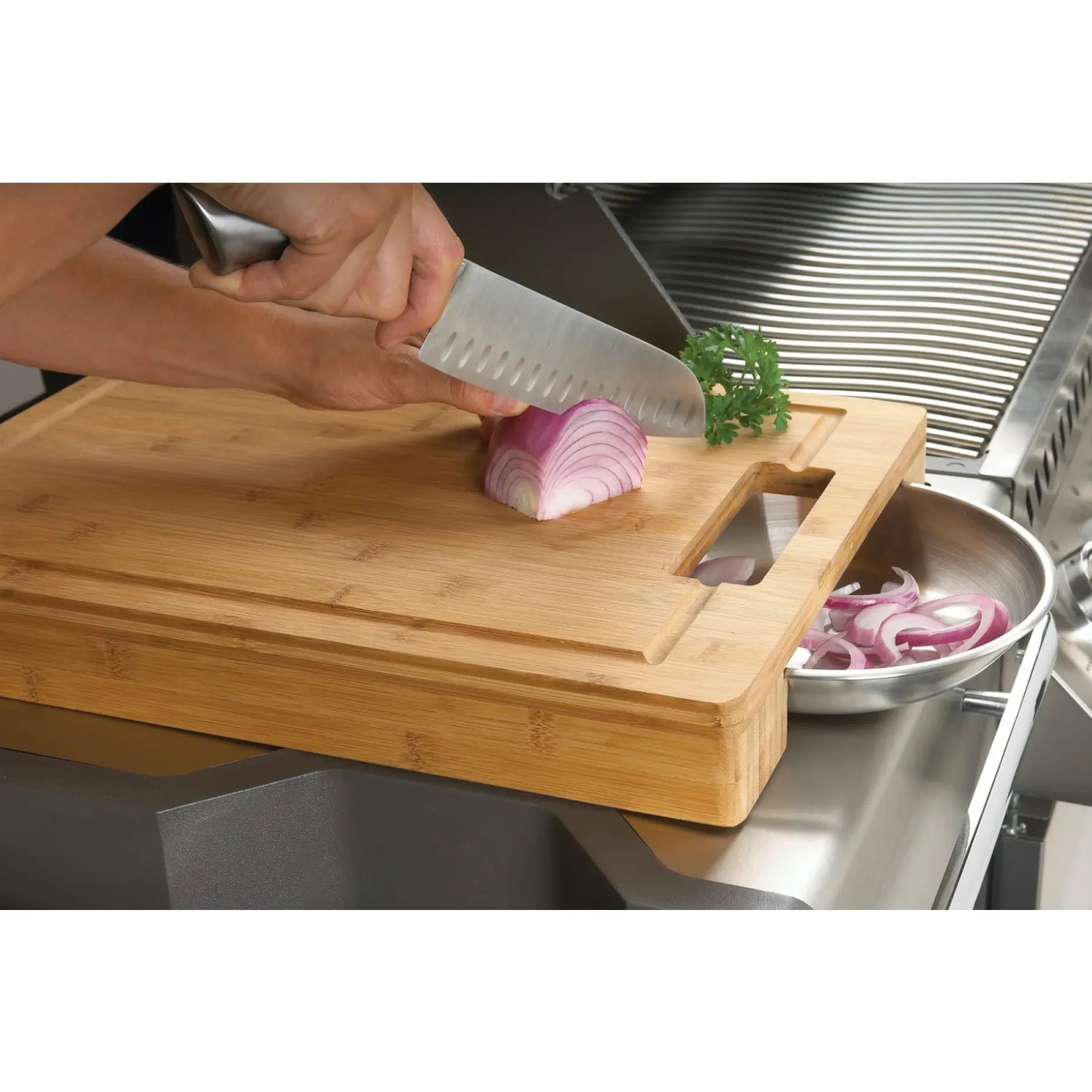 Napoleon Pro skærebræt i bambus giver en funktionel og ryddelig arbejdsflade til madlavning.