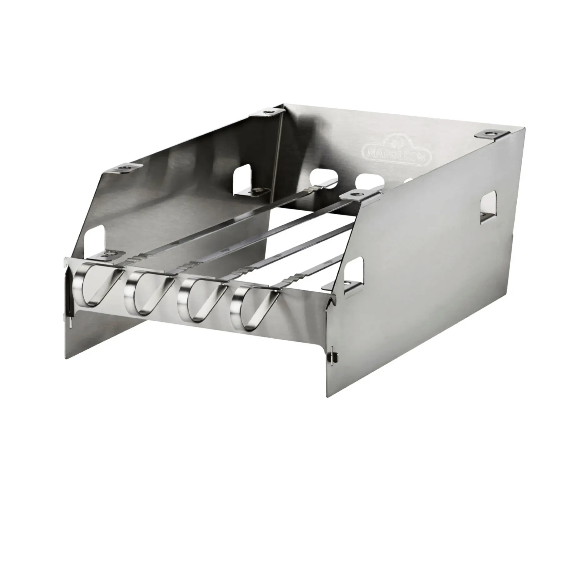 Vindskærmen har fire indbyggede holdere til grillspyd, og der medfølger fire grillspyd i stål. Sizzle Zonens rist kan hæves til to indbyggede niveauer i vindskærmen, så du kan variere afstanden til varmen. Det giver mulighed for at eksperimentere med saucer, grille grøntsager eller arbejde med forskellige tilberedningsgrader.