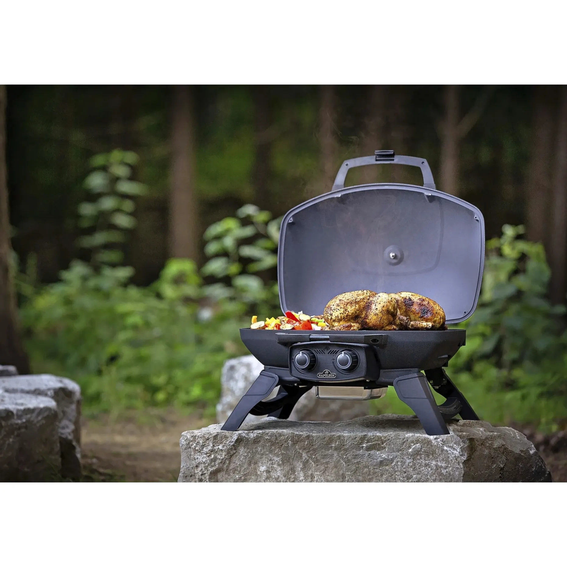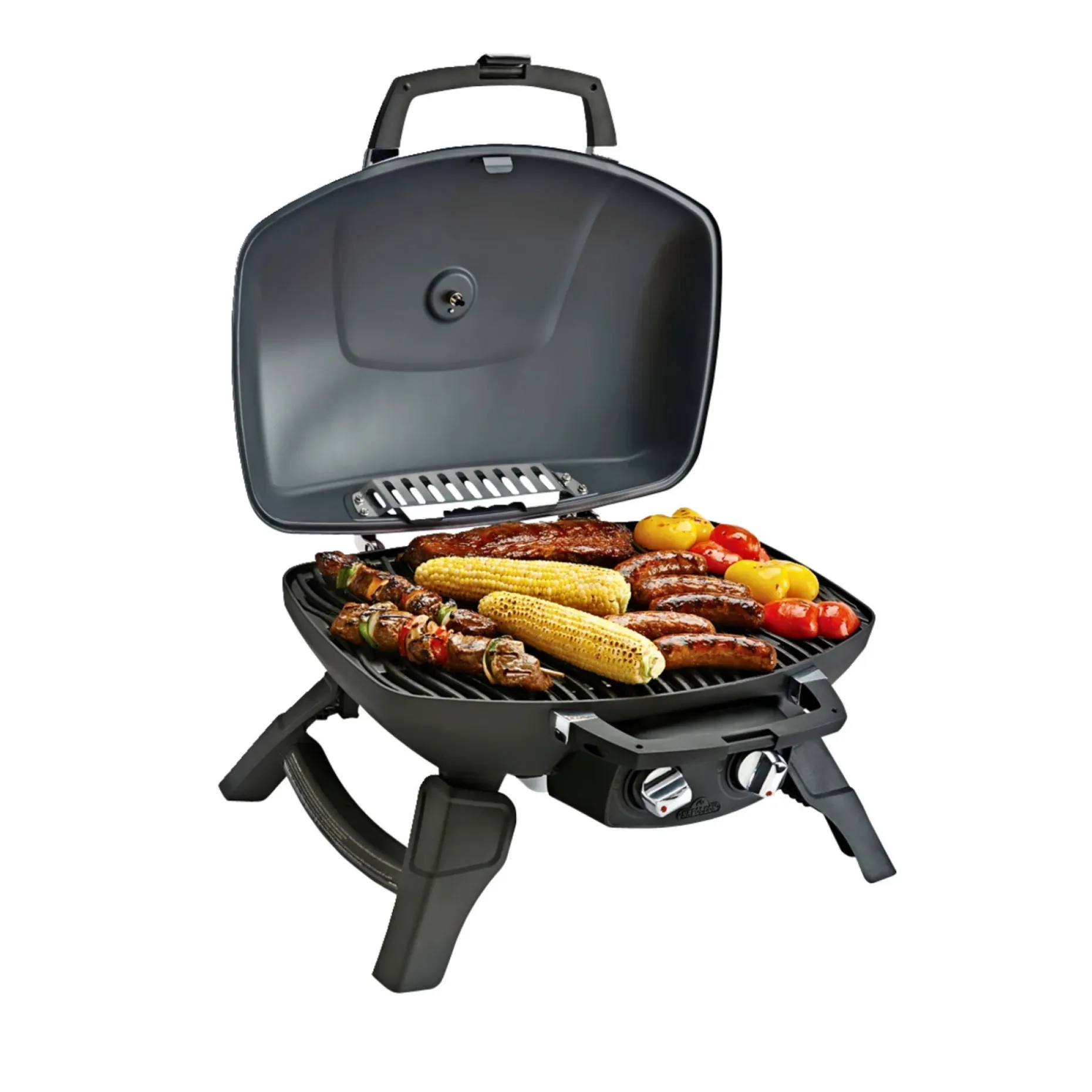 Grillens tætte, kompakte design og praktiske låsbare håndtag gør den let at transportere. Sort låg i udstanset aluminium beskytter komponenterne, og modellen kan stilles på bord, græs, fliser eller sand.