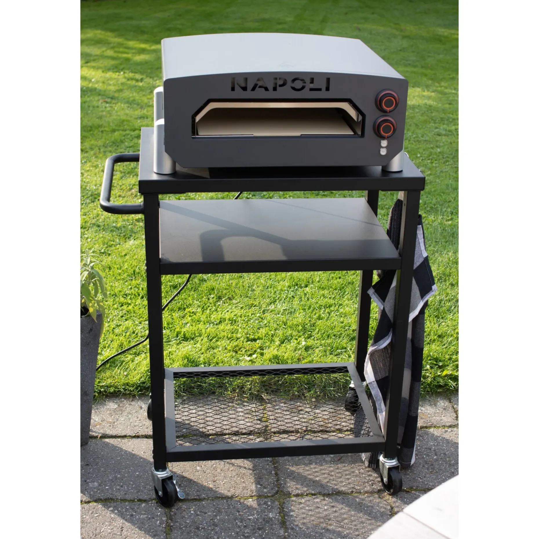Pizzaovnen kan nemt tilsluttes til enhver standard stikkontakt, hvilket gør den bekvem og sikker at bruge. Dens robuste konstruktion og vejrbestandige design gør den perfekt til udendørs brug, så du kan lave lækre pizzaer i alt slags vejr.