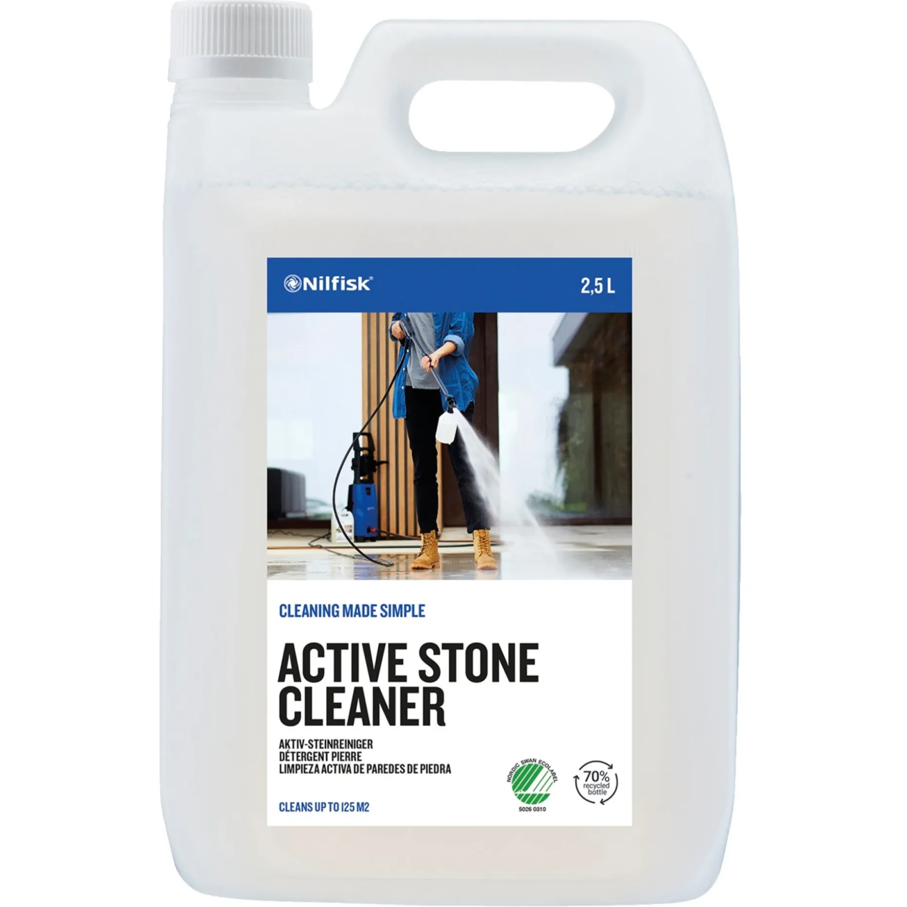 Active Stone Cleaner. Indhold: 2,5 liter. Svanemærket produkt. Officielt nordisk miljømærke. Rengøringsmiddel til rengøring af beton, sten og fliser Lad produktet virke i 15-20 minutter. Undgå at ramme beplantning og malede overflader, ellers skyl efter med rent vand.