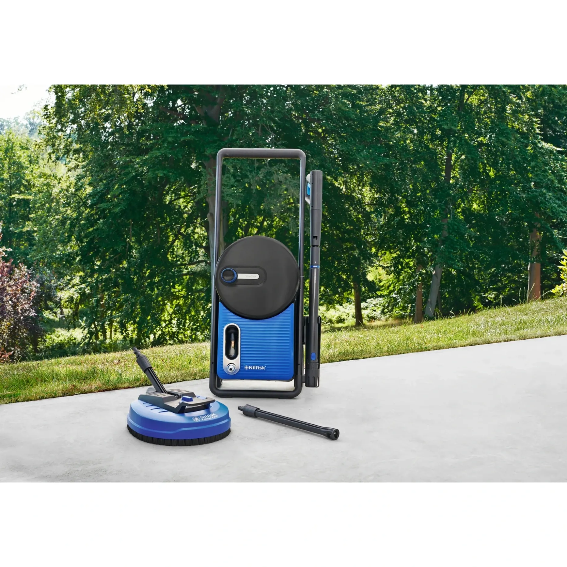 | Medleveret tilbehør | Power Patio terrassevasker, Gentle & Rough dyse med 3-vejs trykregulering, Super kort dyse – Nem og skånsom rengøring, Power Skumsprayer & beholder – Fyldigt og klæbende skum, •12 m STEEL FLEX højtryksslange med lynkobling – længere levetid, Smart Assistant touch screen |
