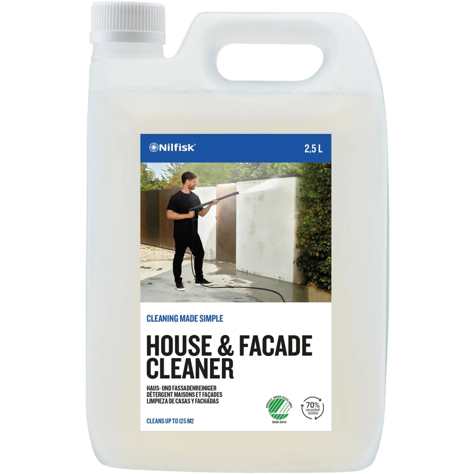 House & Facade Cleaner. Indhold: 2,5 liter. Svanemærket produkt. Officielt nordisk miljømærke. Mildt skumrengøringsmiddel til rengøring og vedligeholdelse af murværk, facader, fliser m.v. Rengør hurtigt og effektivt for de fleste almindelige forekommende snavstyper. Angriber ikke planter og græs.