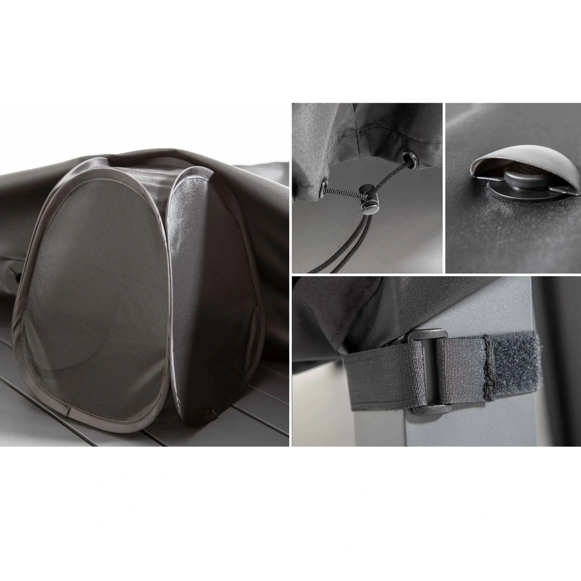 Betrækket er behandlet med polyurethan (PU coated), så vand ikke så let trænger ind til dine havemøbler. Desuden er det åndbart. Outrium havemøbelovertrækket er sort og kommer en i smart pose med håndtag.