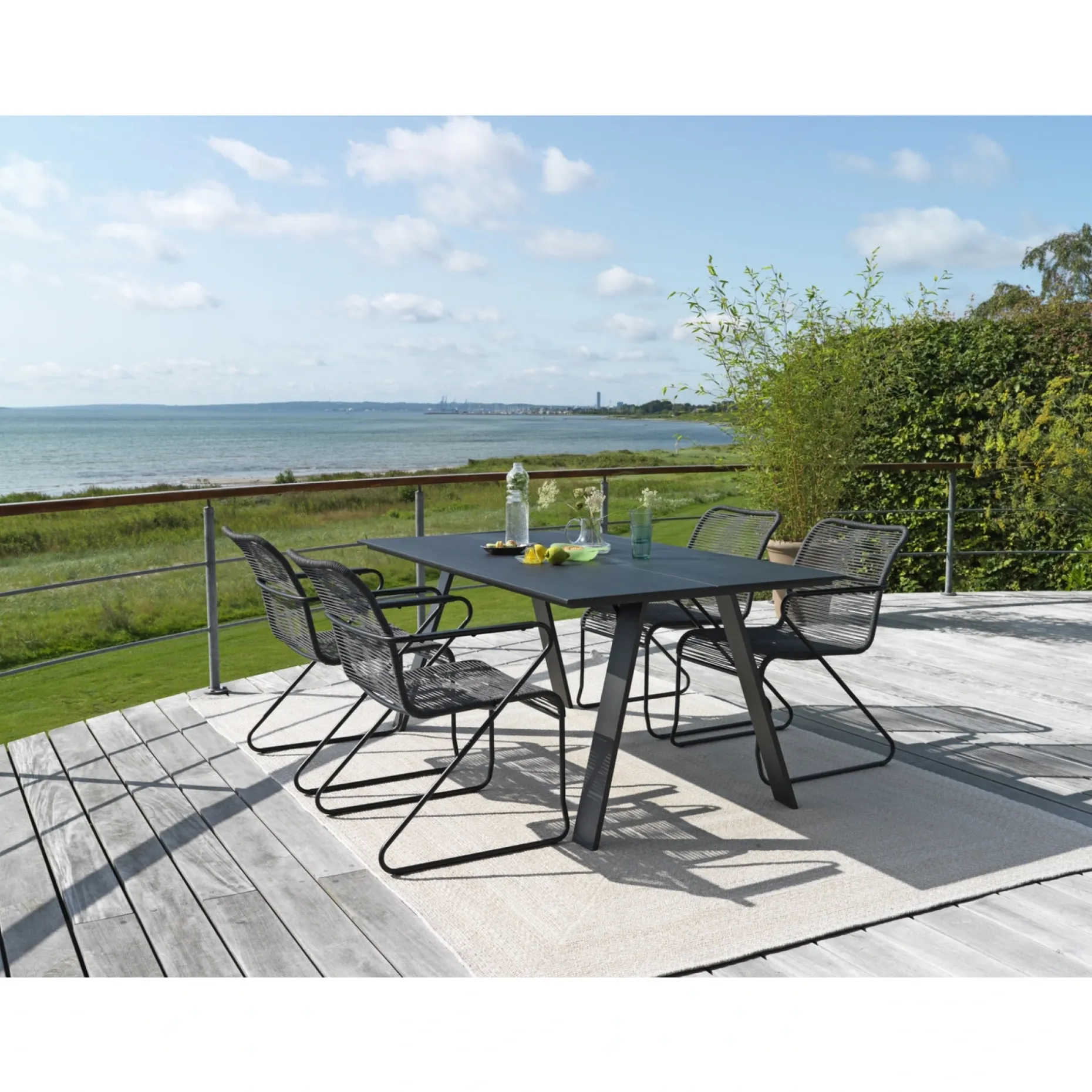 Hertil 4 Bilbao stole med antracitgrå rebflet og pulverlakeret stålstel.