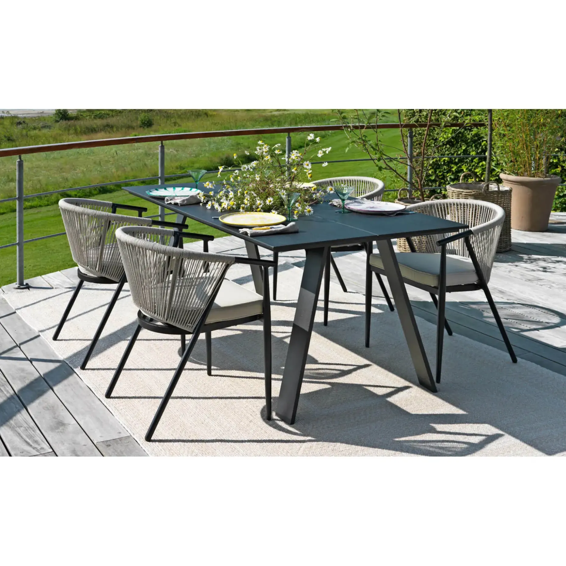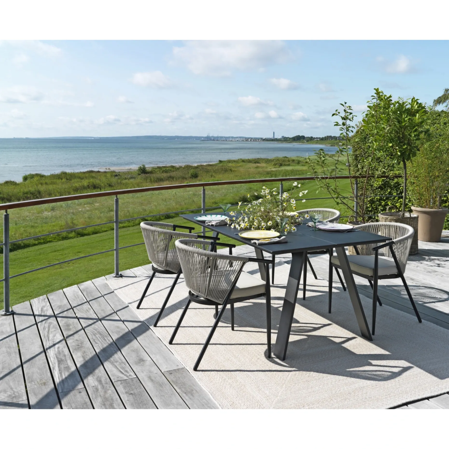 Plankebord L165xB100xH74 cm med sort nonwood bordplade og alustel. Hertil 4 Como stabelbare stole med lys sand rebflet og alustel. Inkl. hynder.